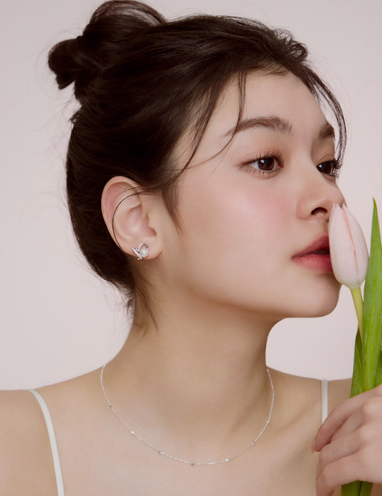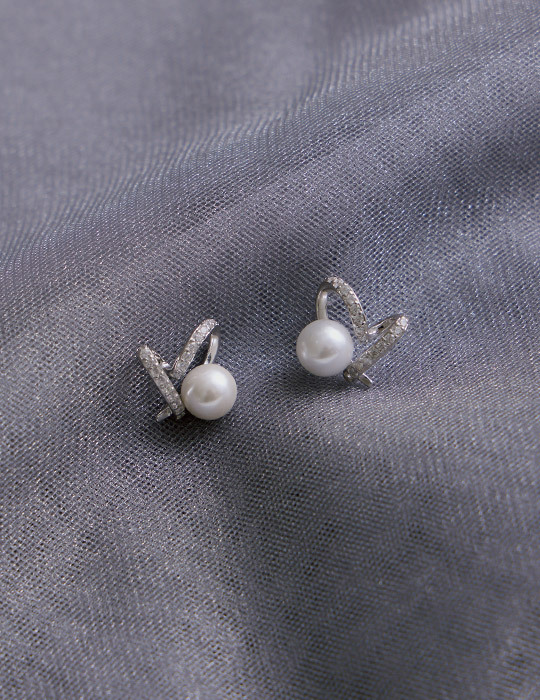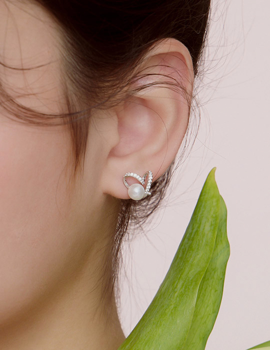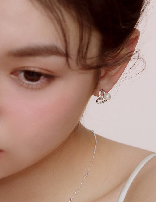 【925純銀】珍珠愛心排鑽。銀針耳環