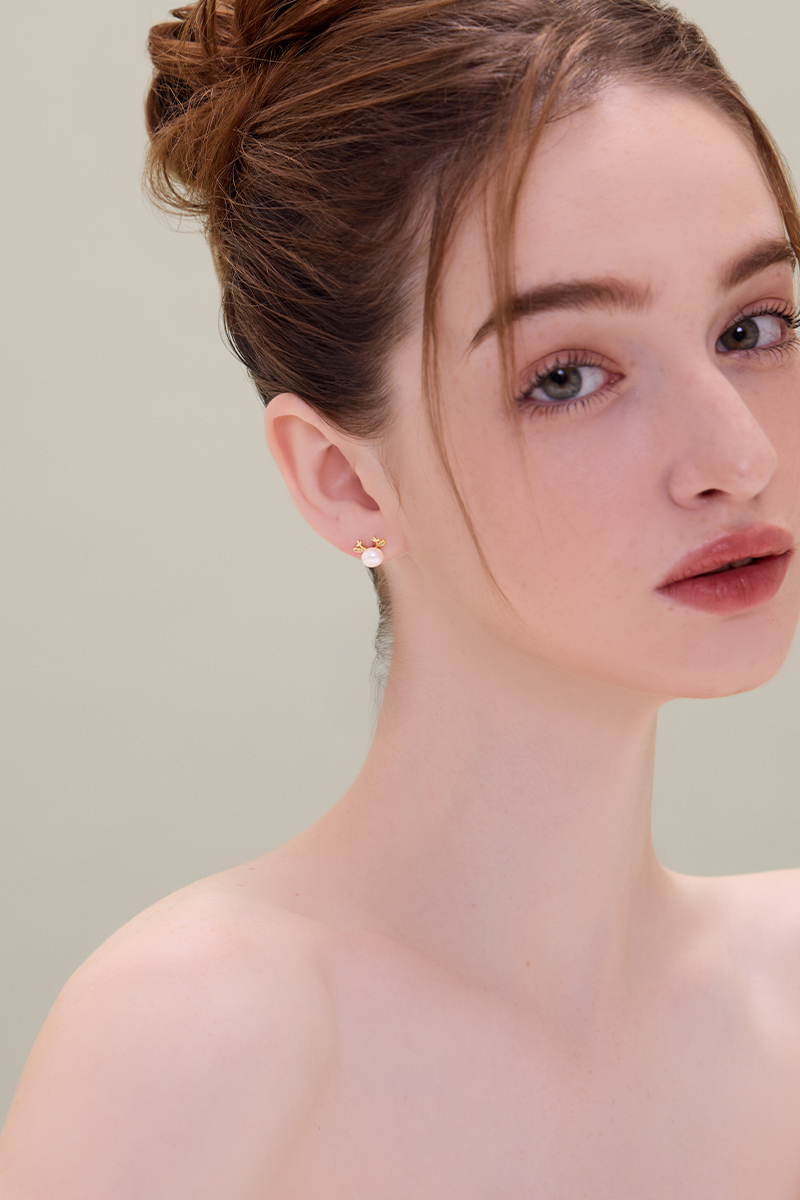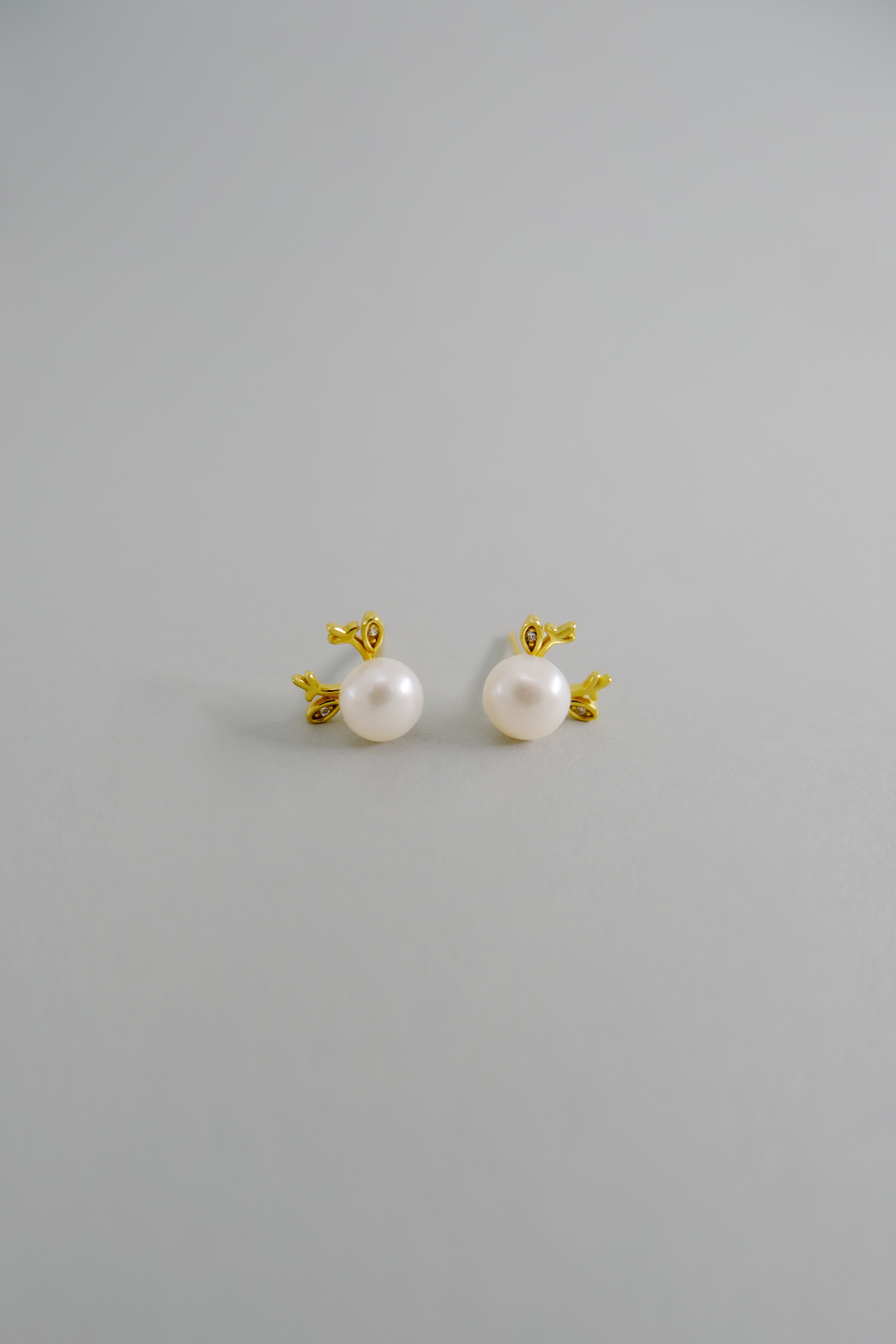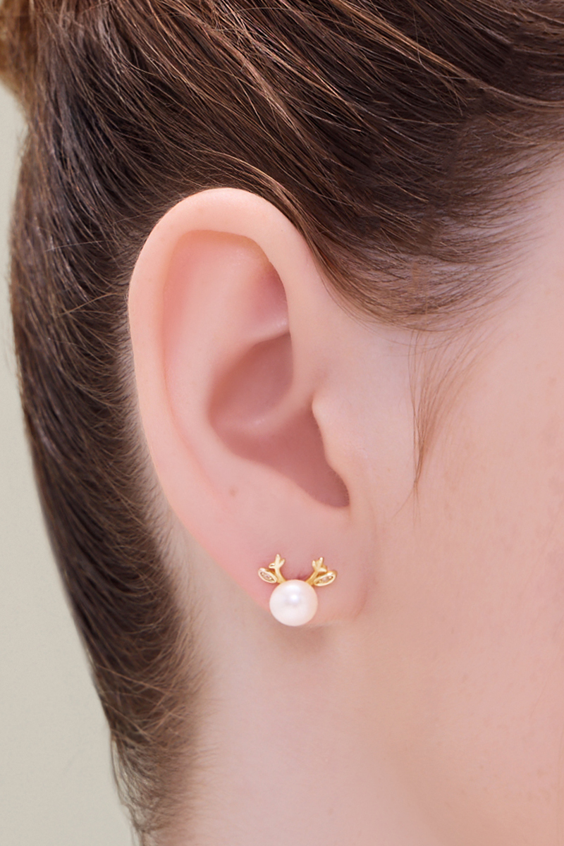 【925純銀】聖誕限定淡水珍珠小鹿。銀針耳環(金)