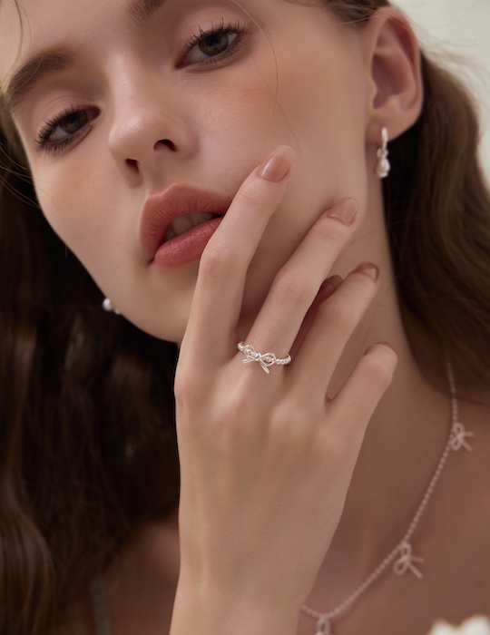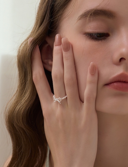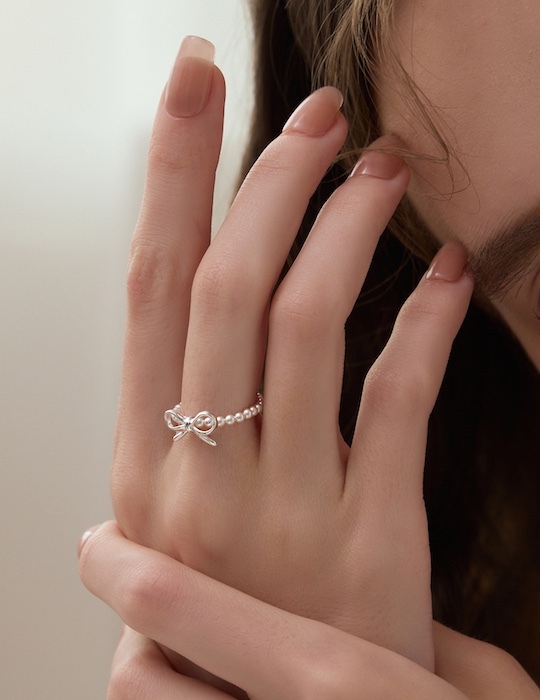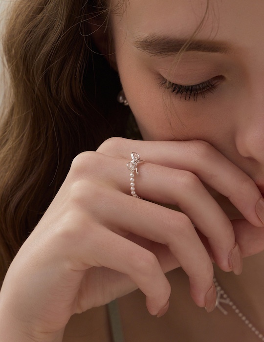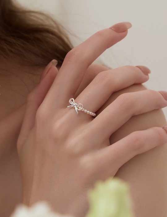 【925純銀】蝴蝶結珍珠彈性繩戒指