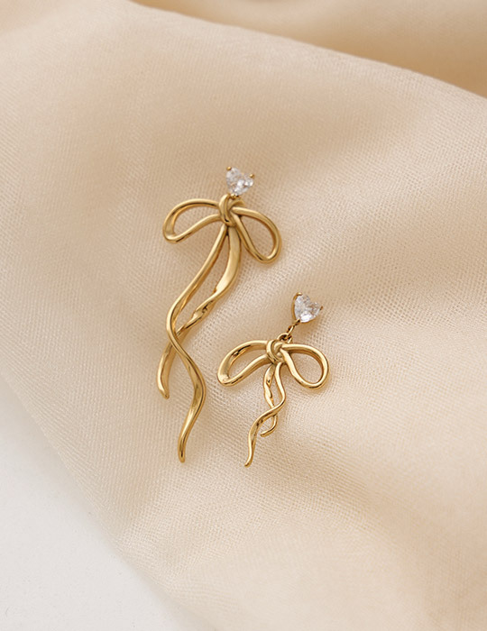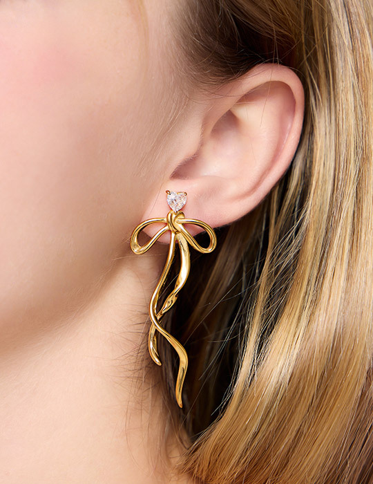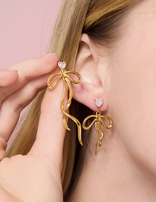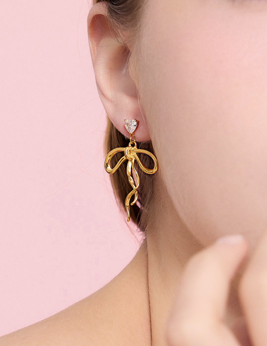 【鈦鋼】愛心鋯石蝴蝶結流蘇。針式耳環