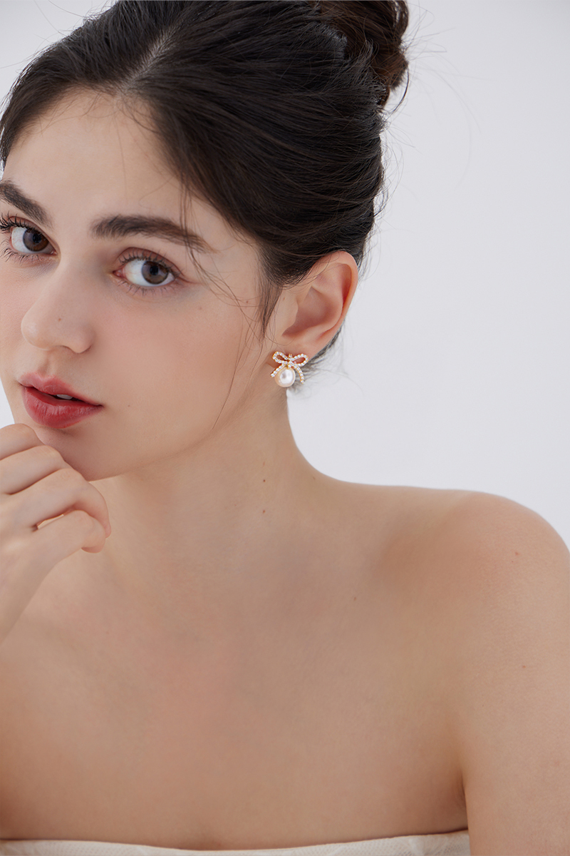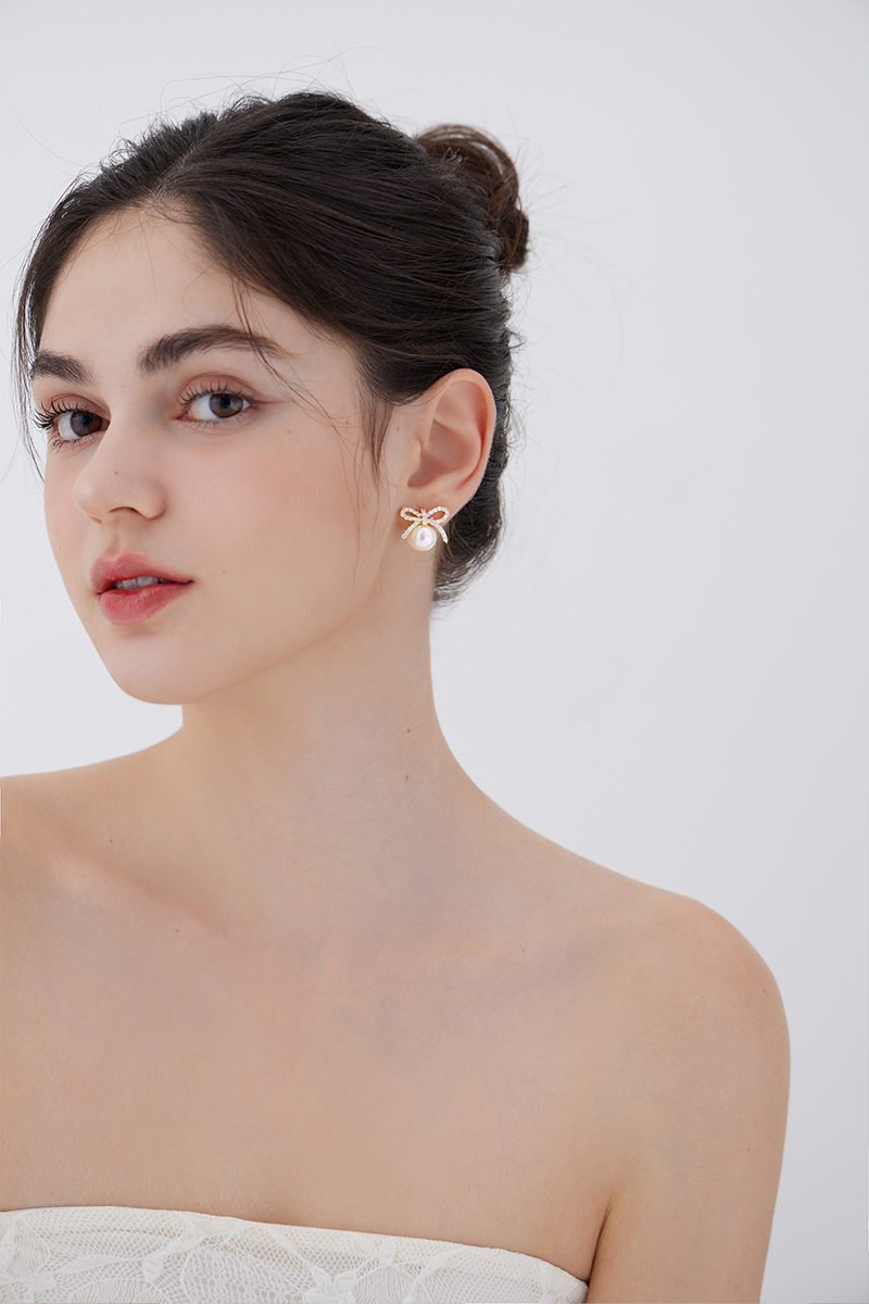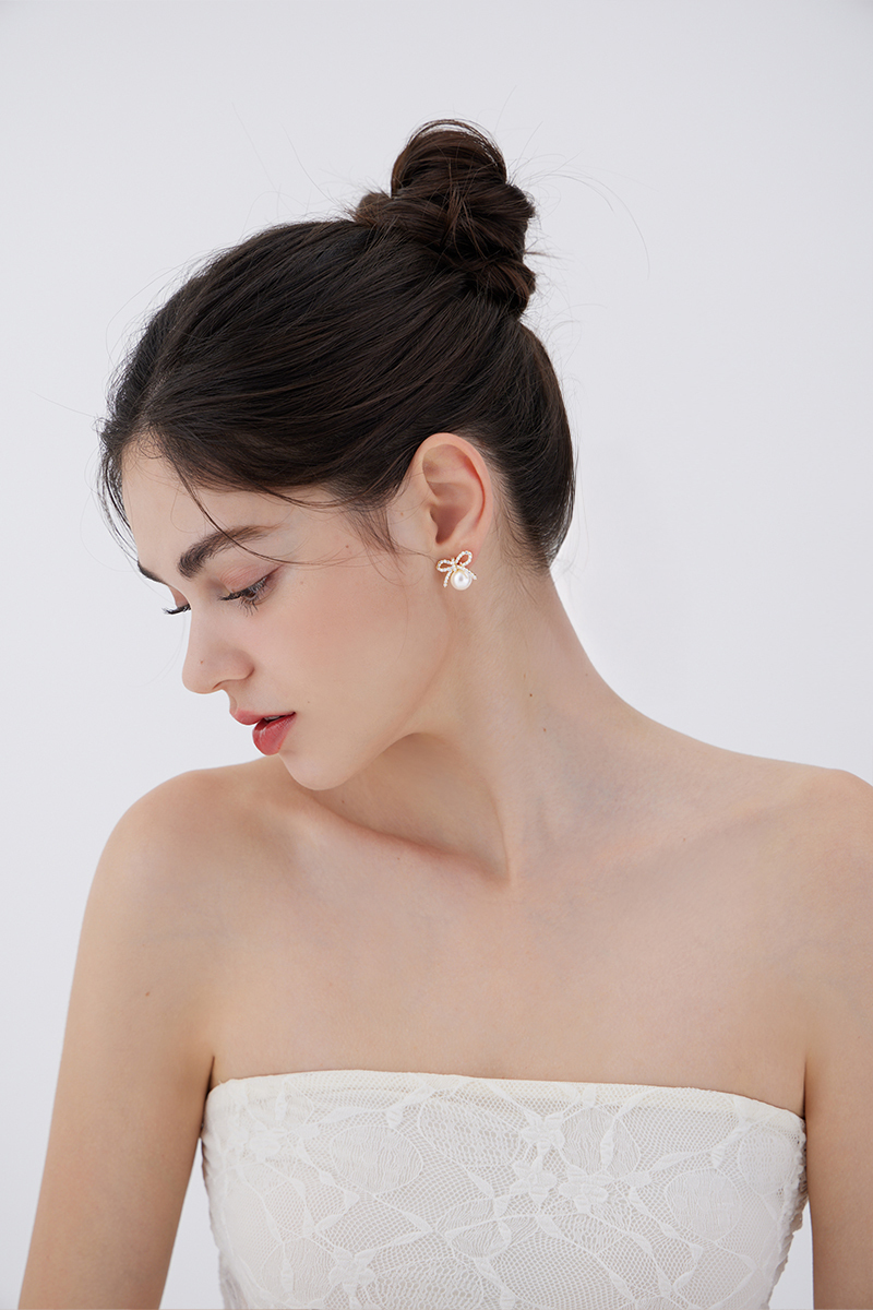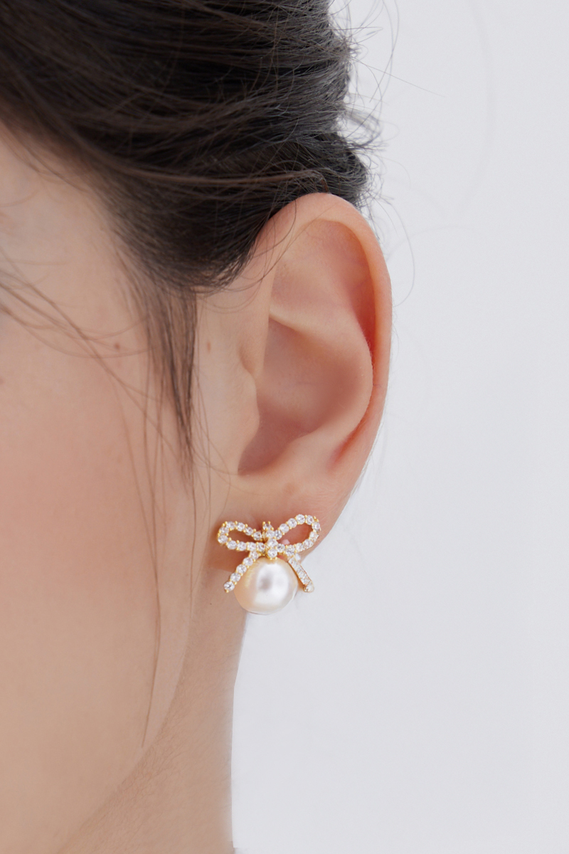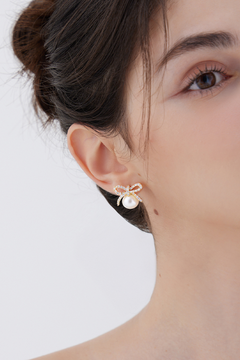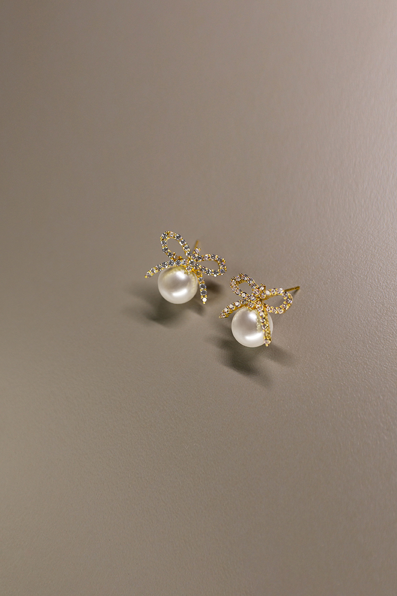 奢華閃耀蝴蝶結珍珠。銀針耳環(金)