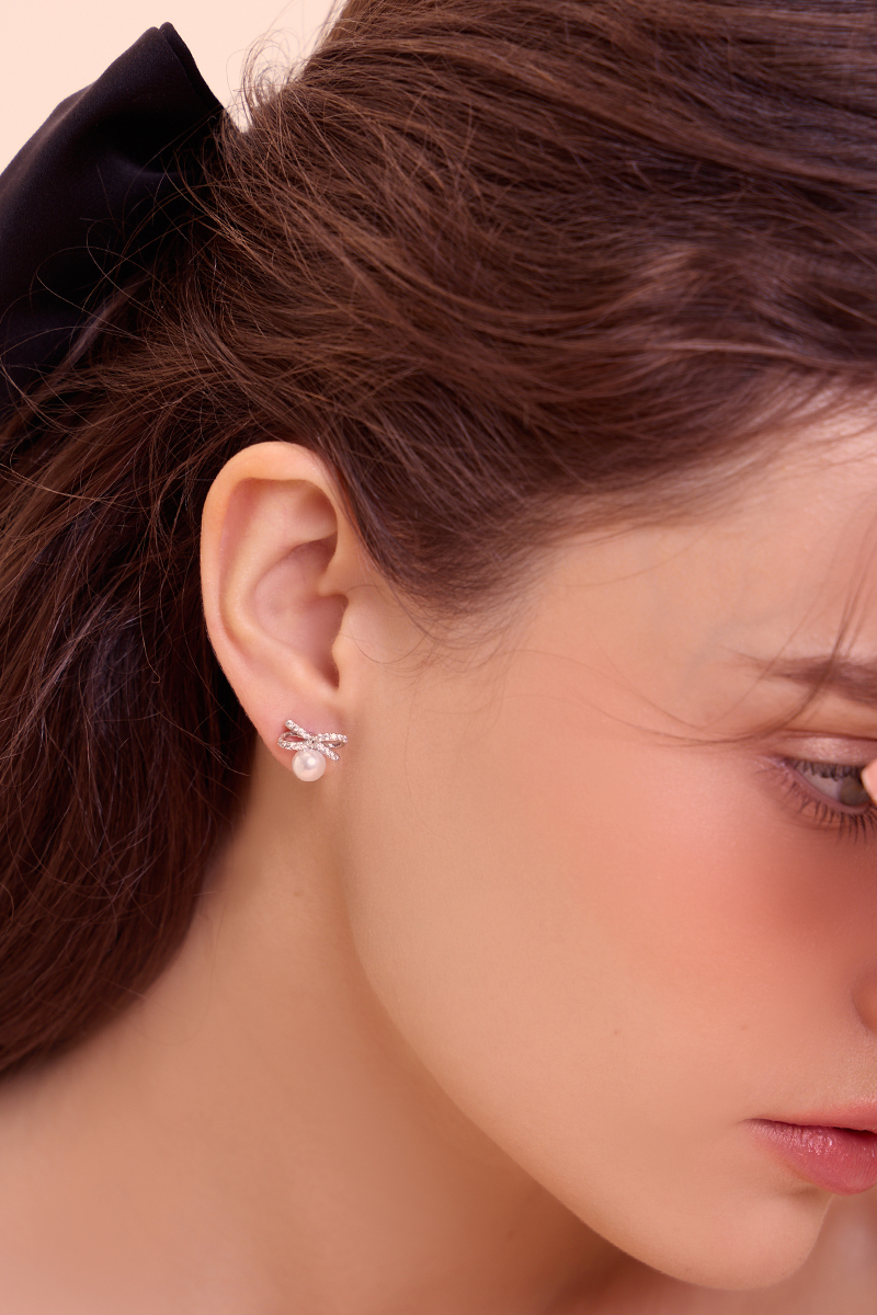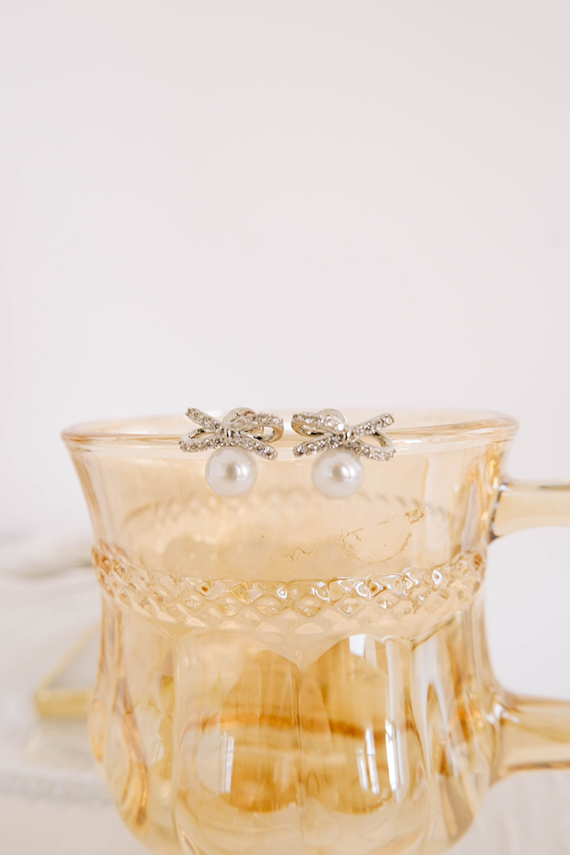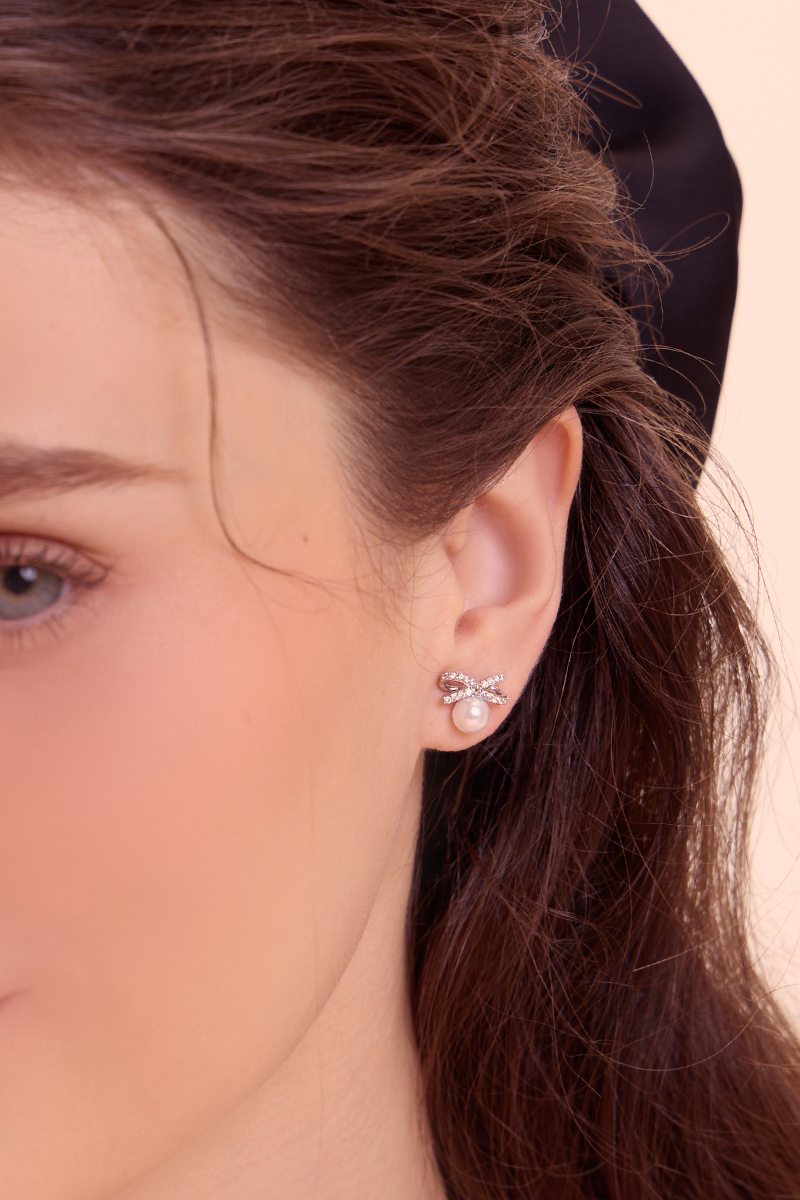 商品名稱: 小巧蝴蝶結鋯石珍珠。銀針耳環