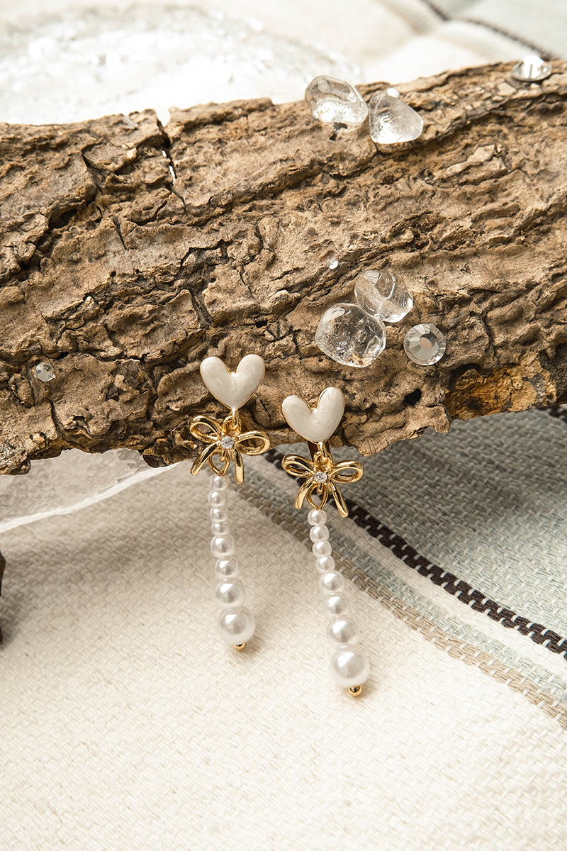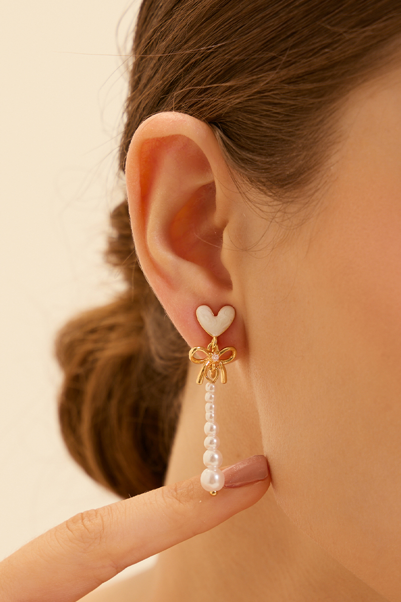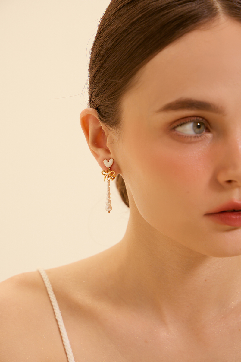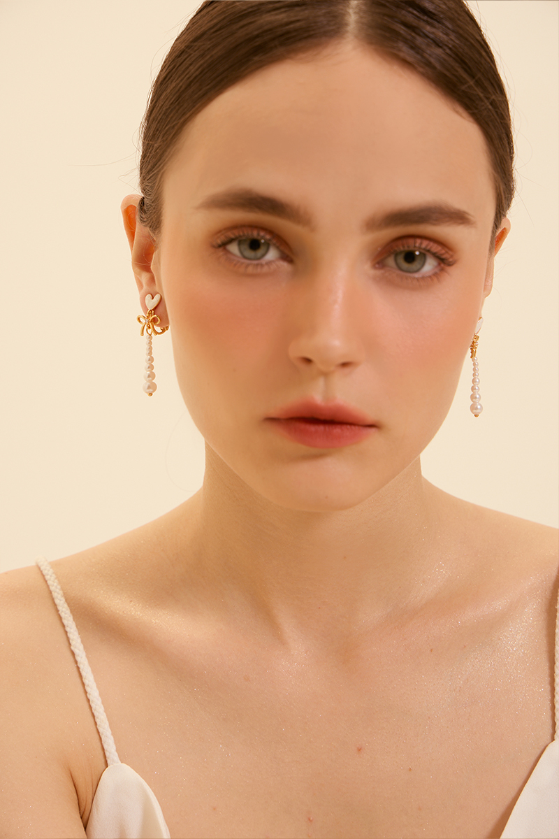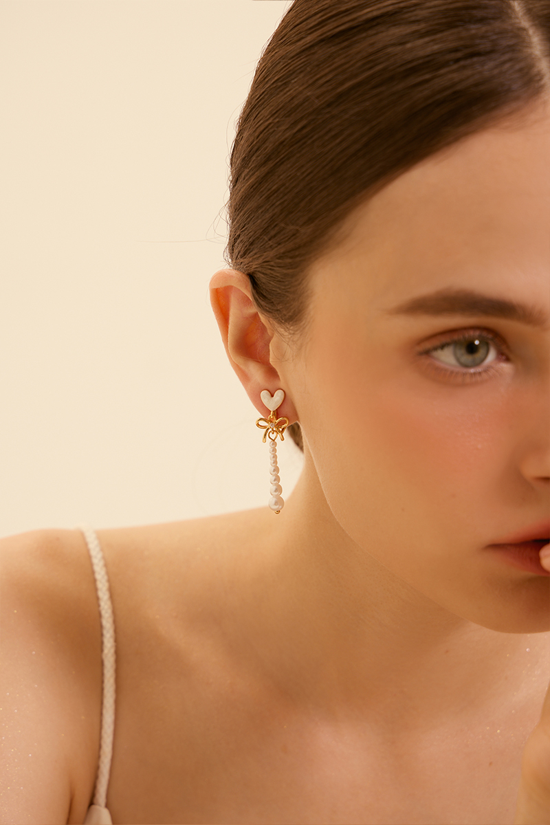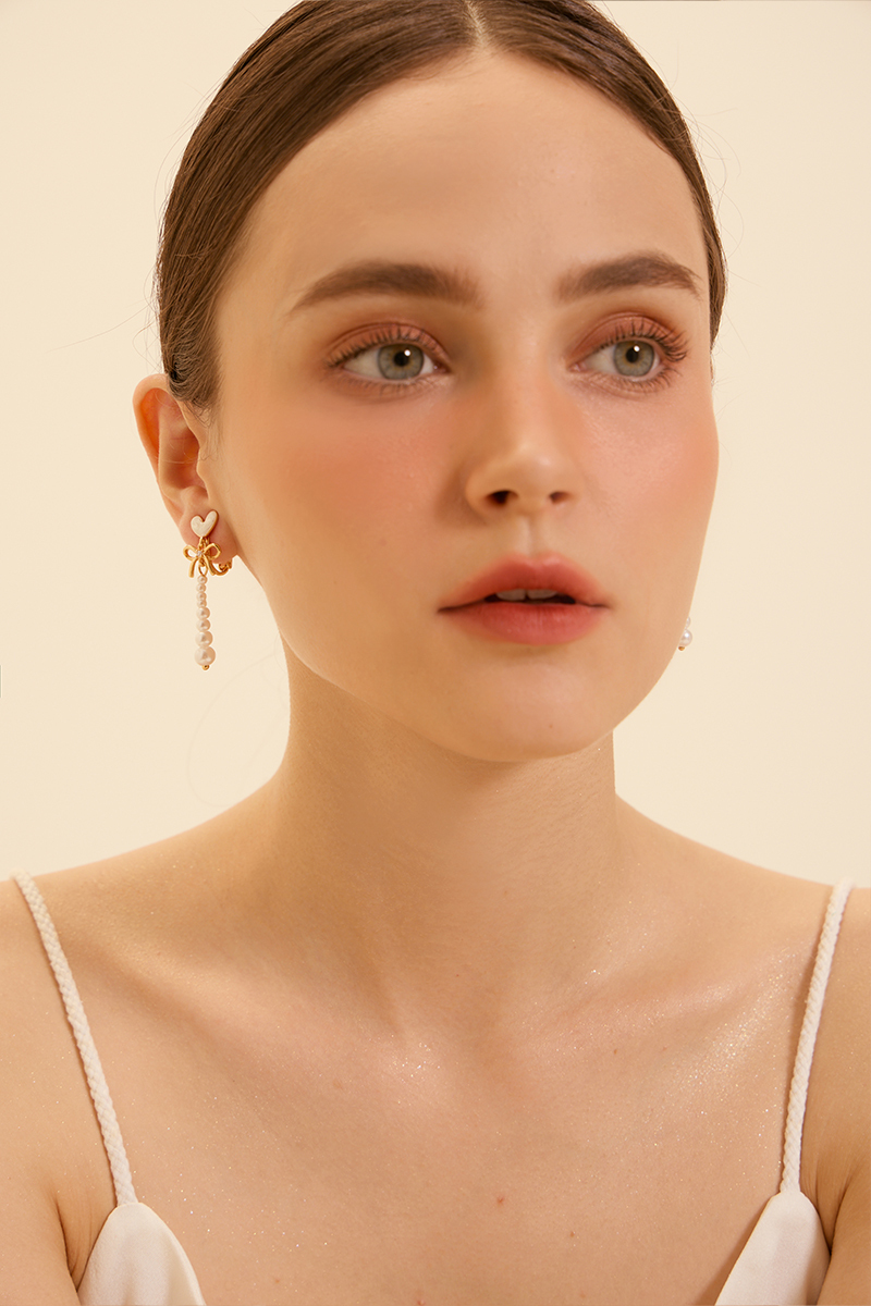 心型透光珍珠垂墜。夾式耳環