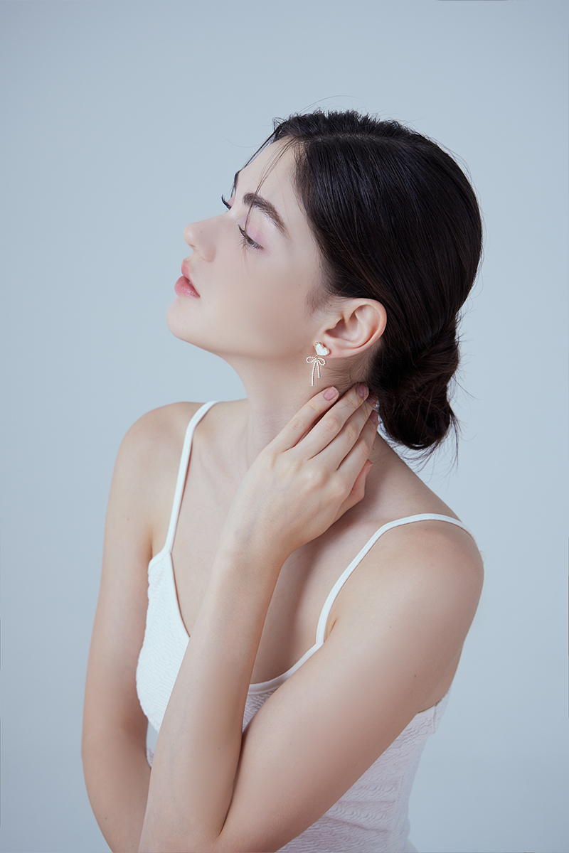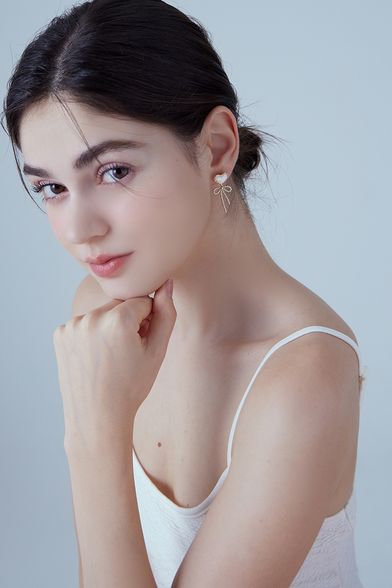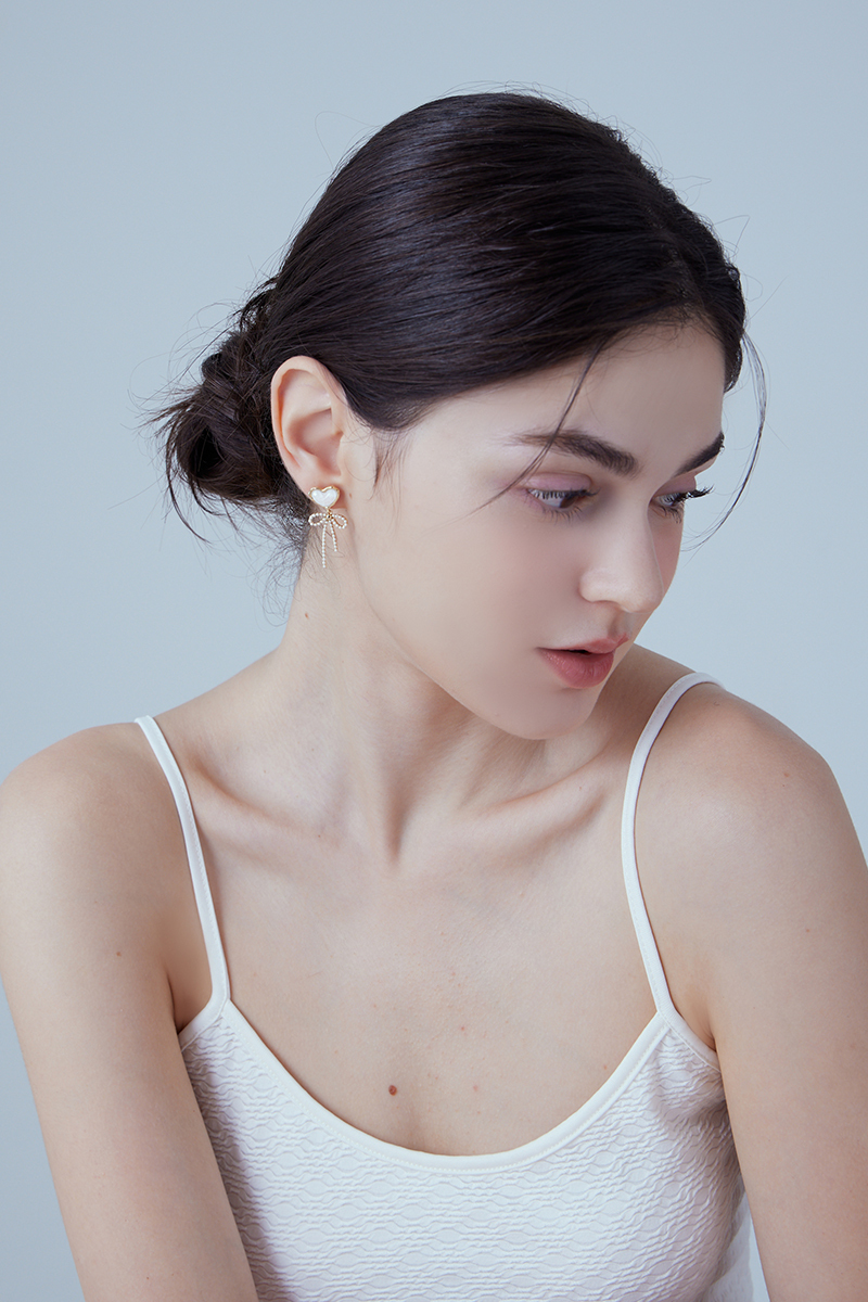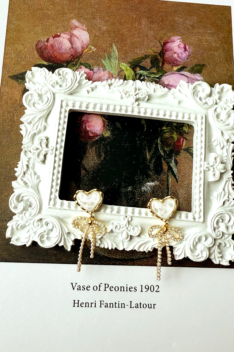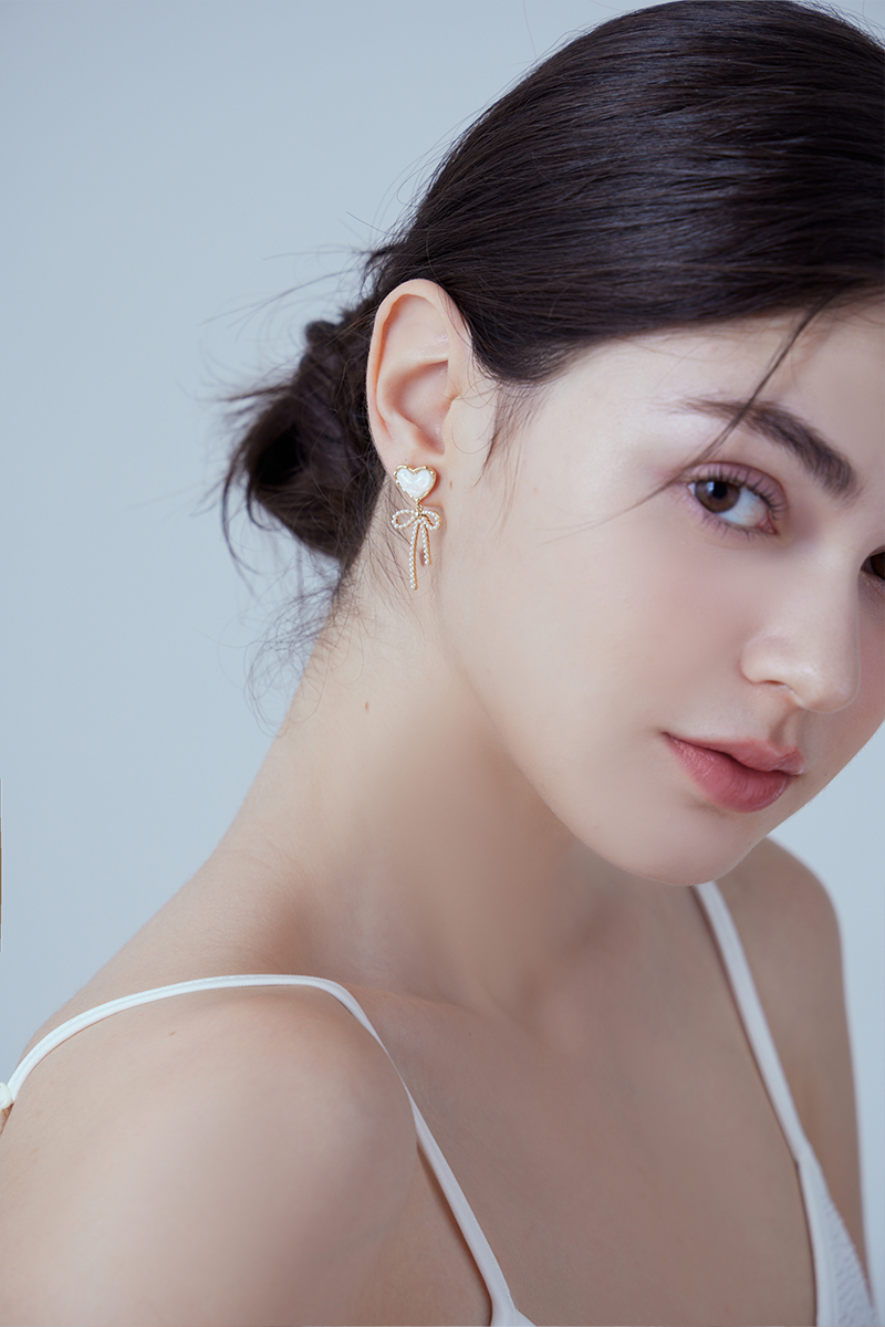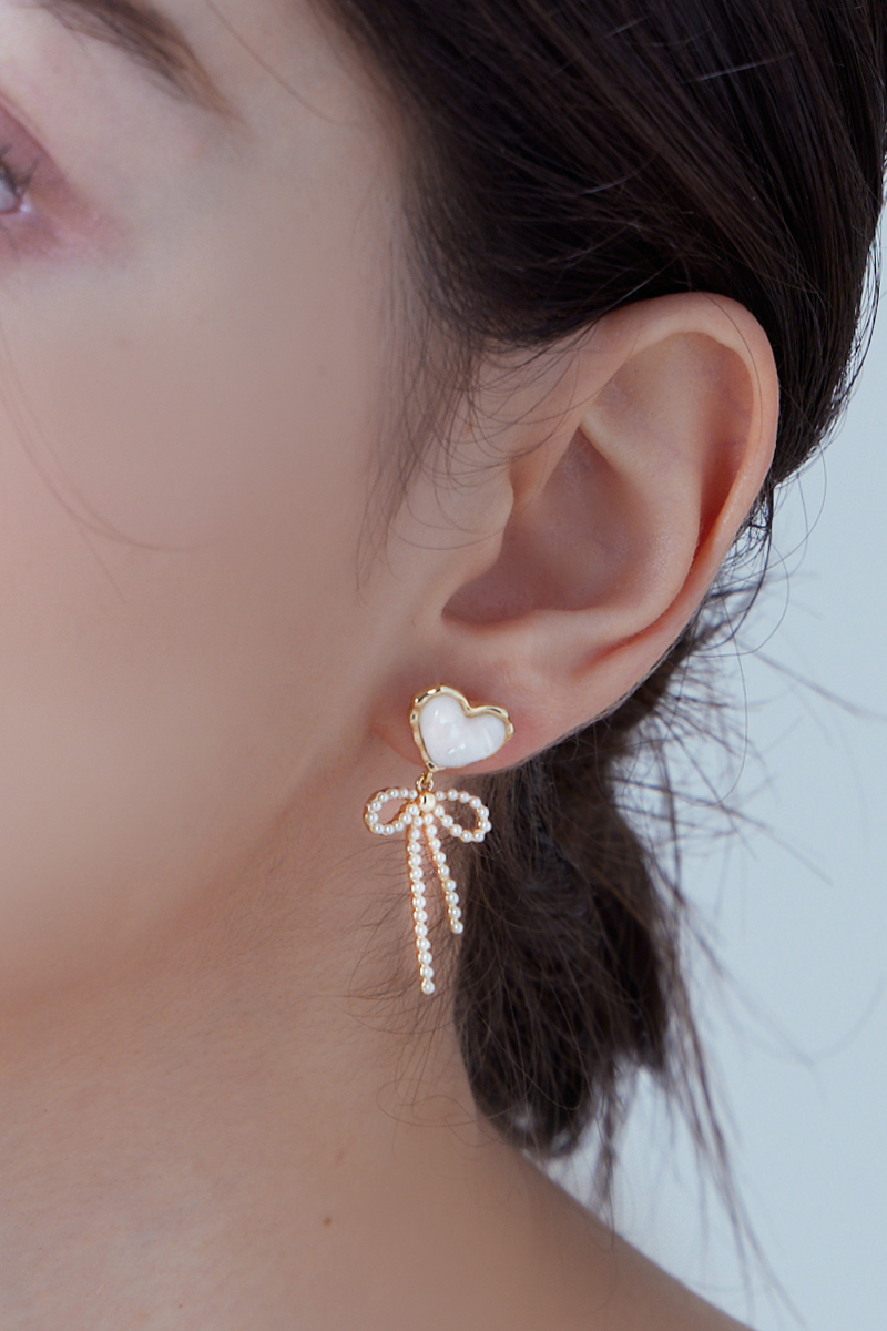 愛心貝母垂墜蝴蝶結。銀針耳環