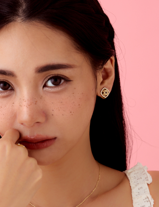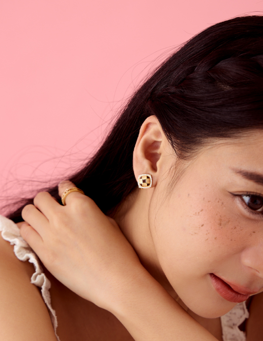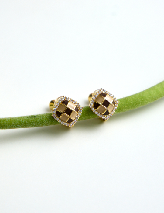 棋盤格鑲嵌鋯石。夾式耳環