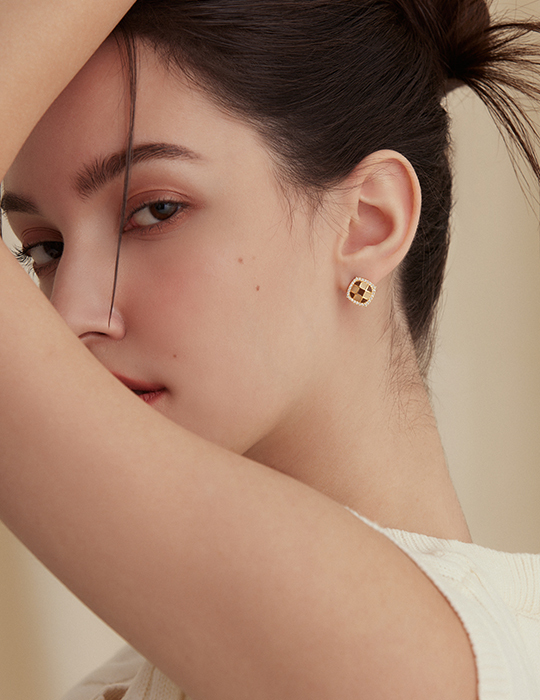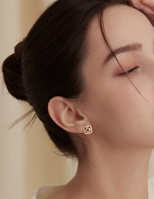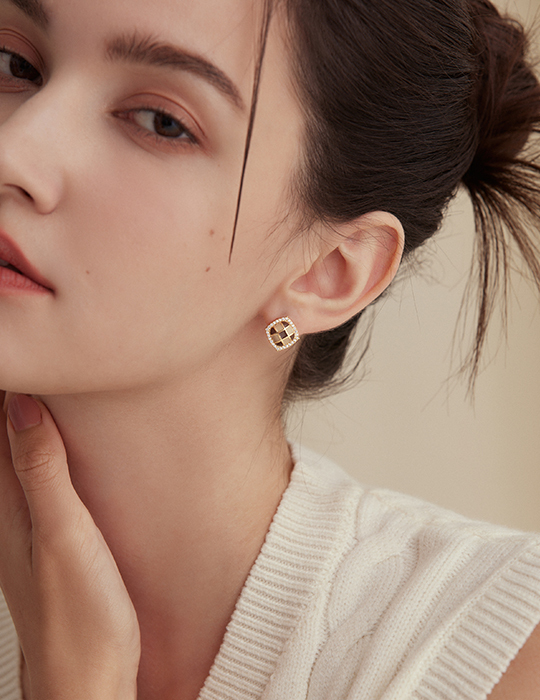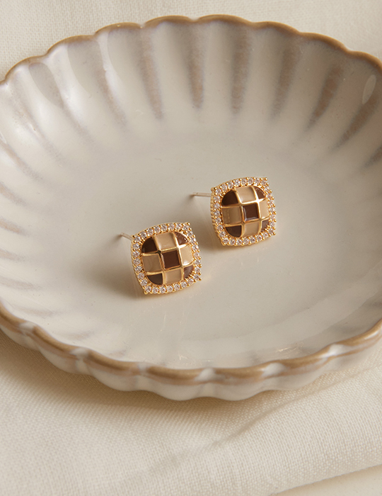 棋盤格鑲嵌鋯石。銀針耳環