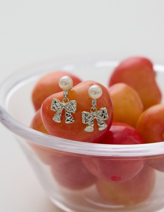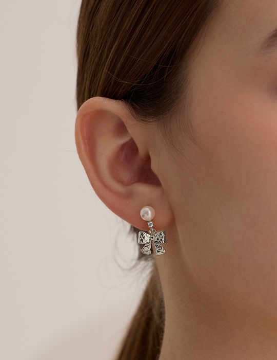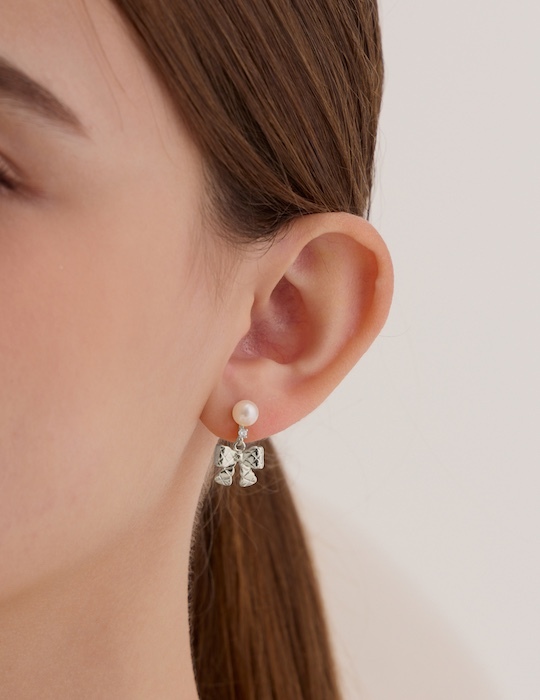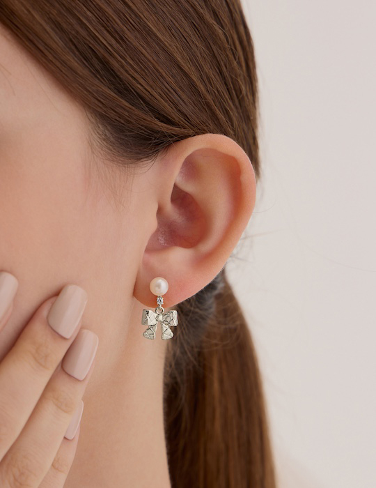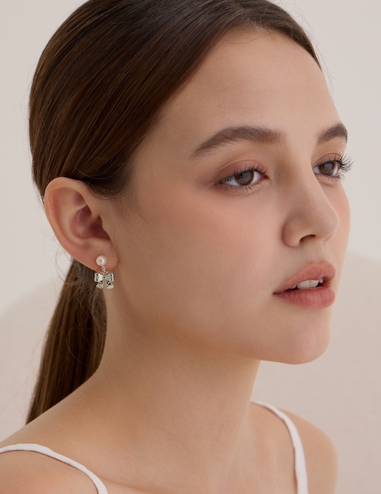 氣質珍珠菱格蝴蝶結。銀針耳環(銀)