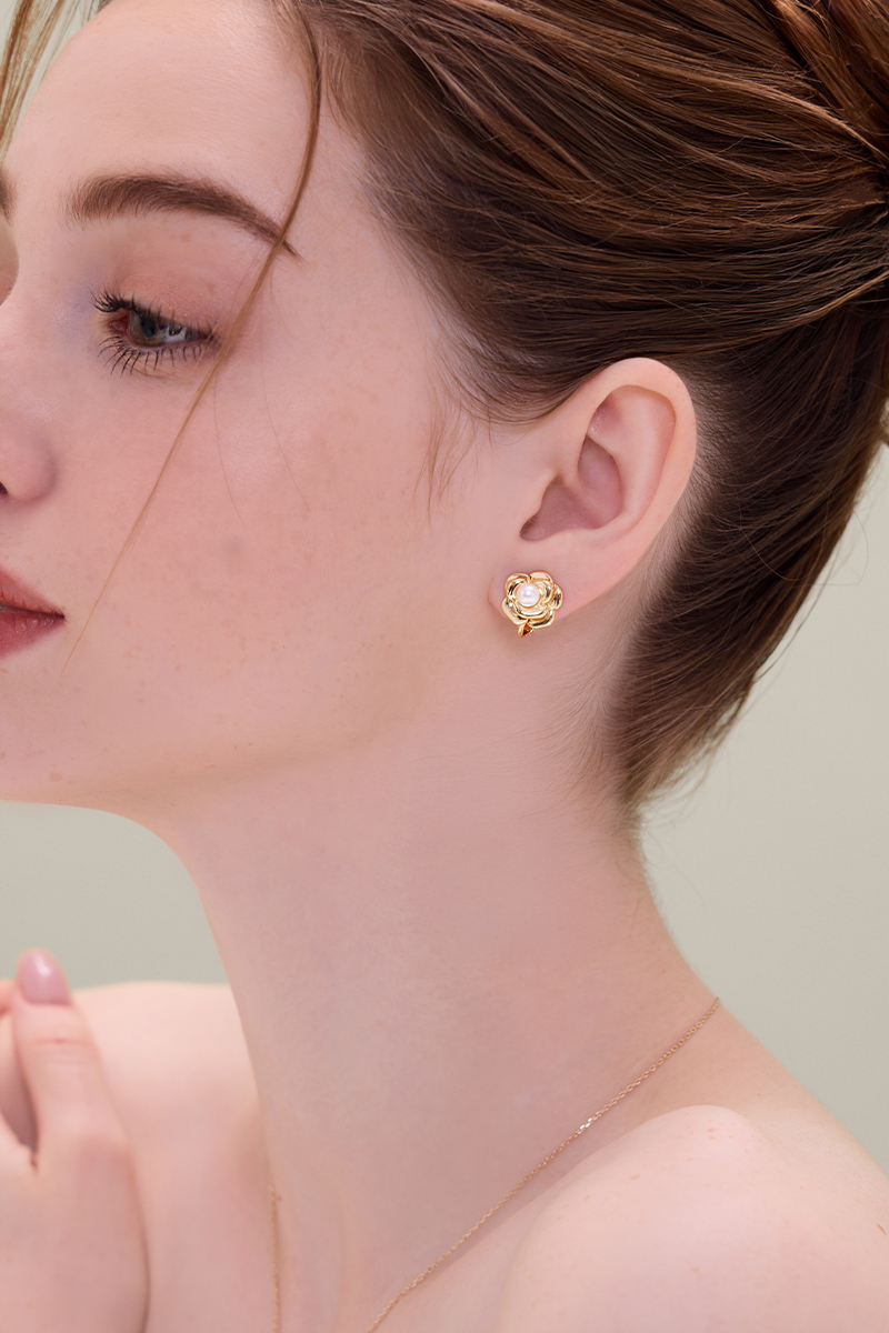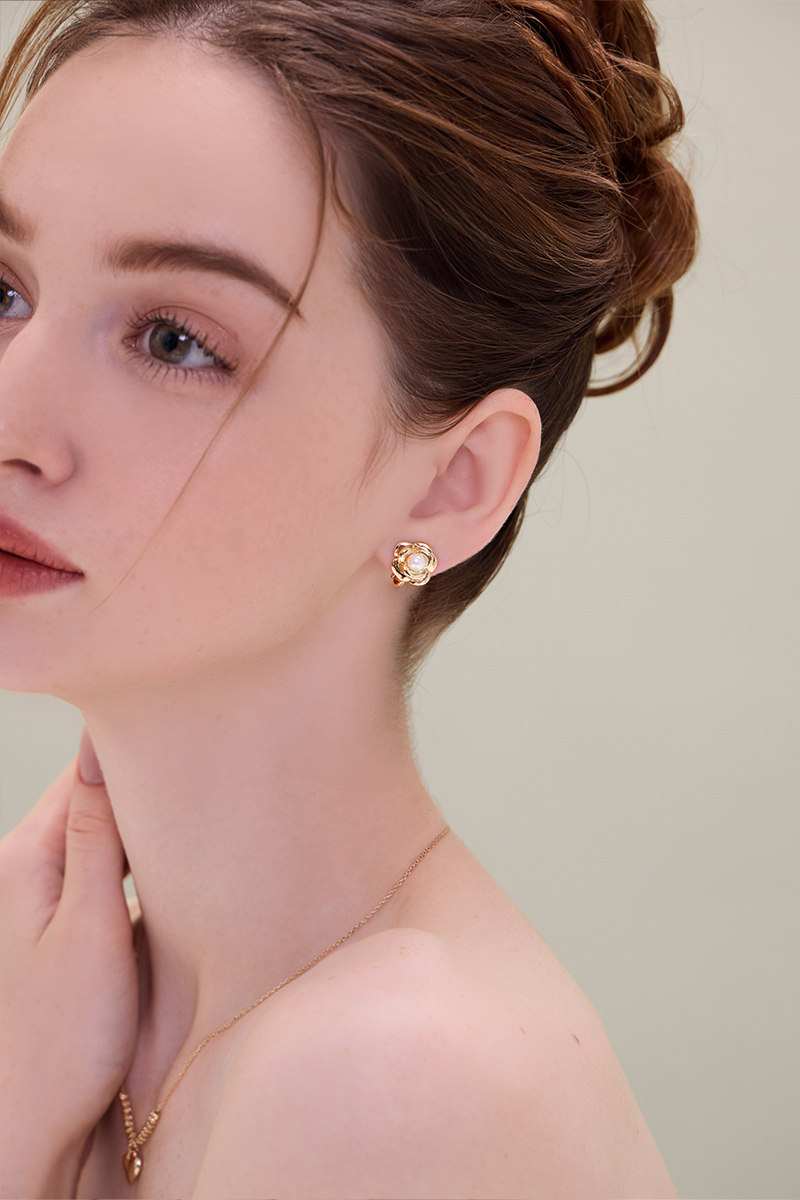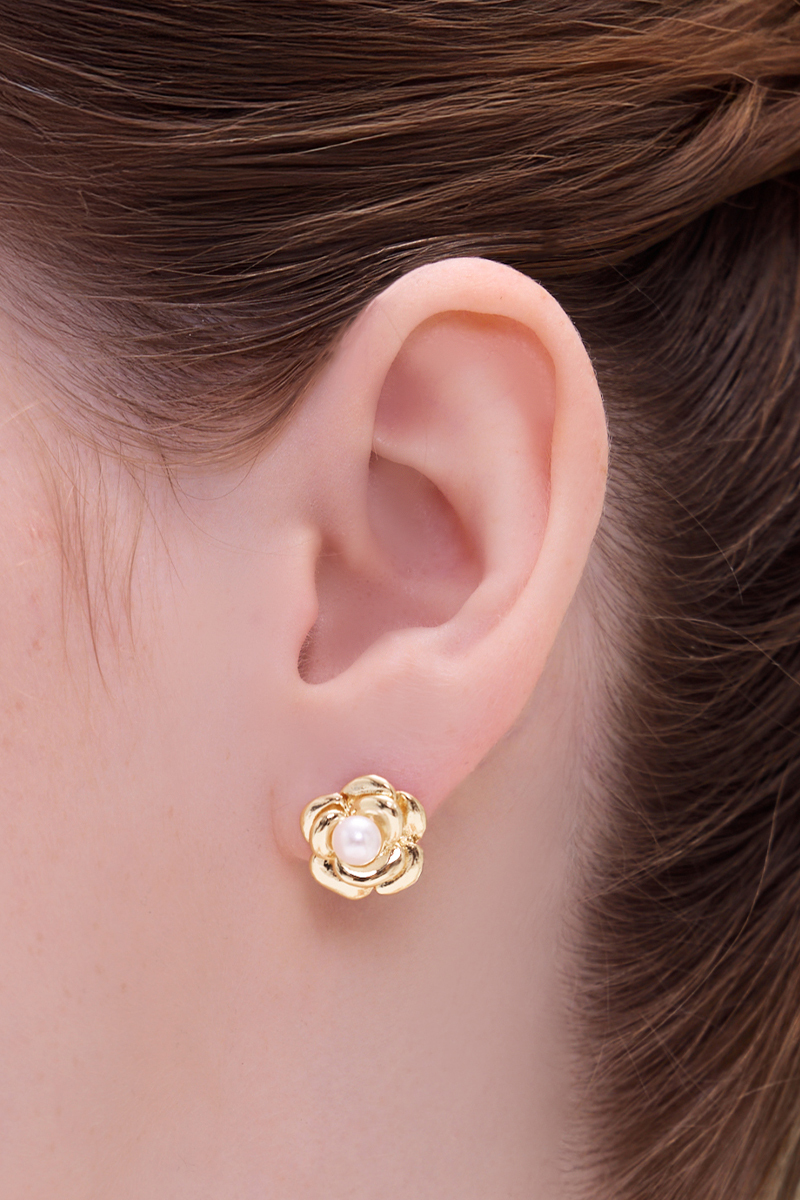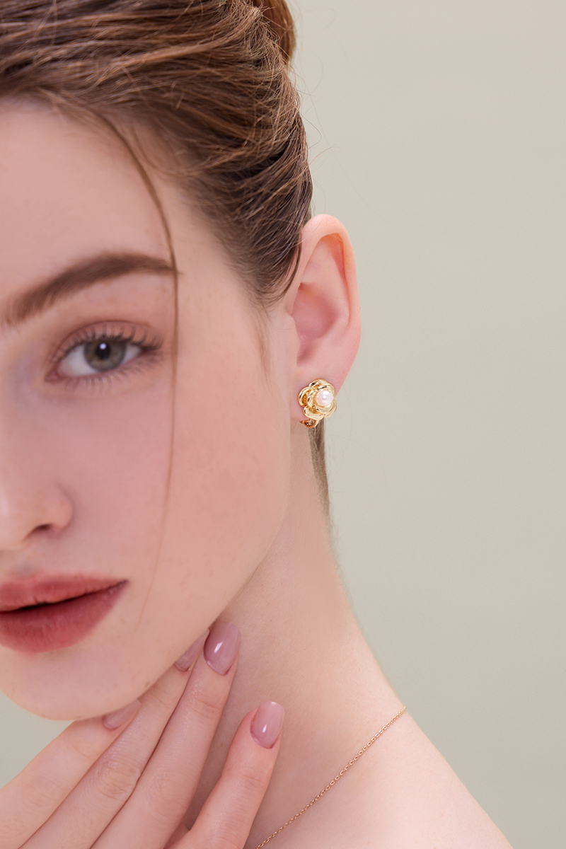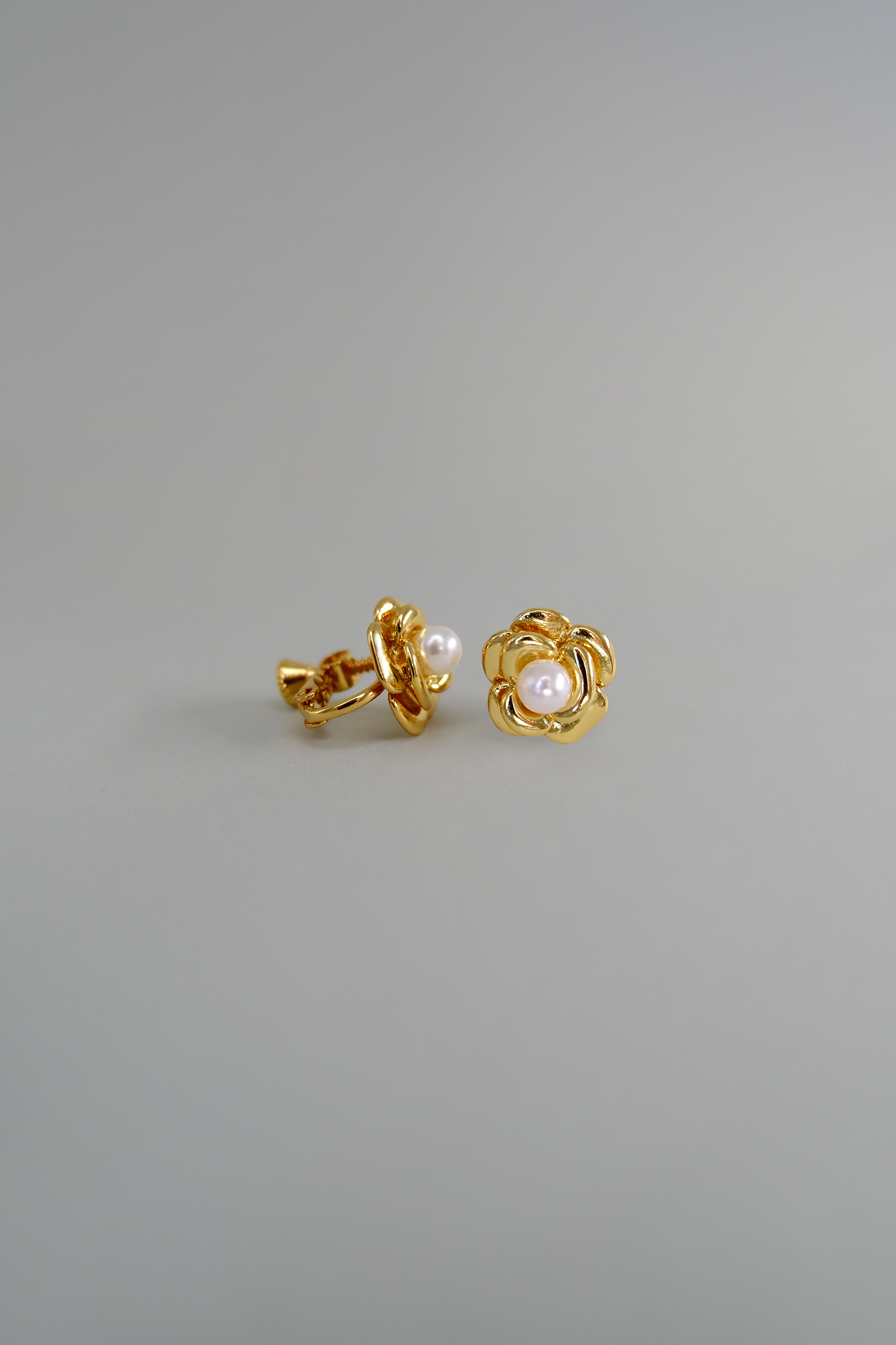 法式優雅金屬珍珠花朵。夾式耳環(金)