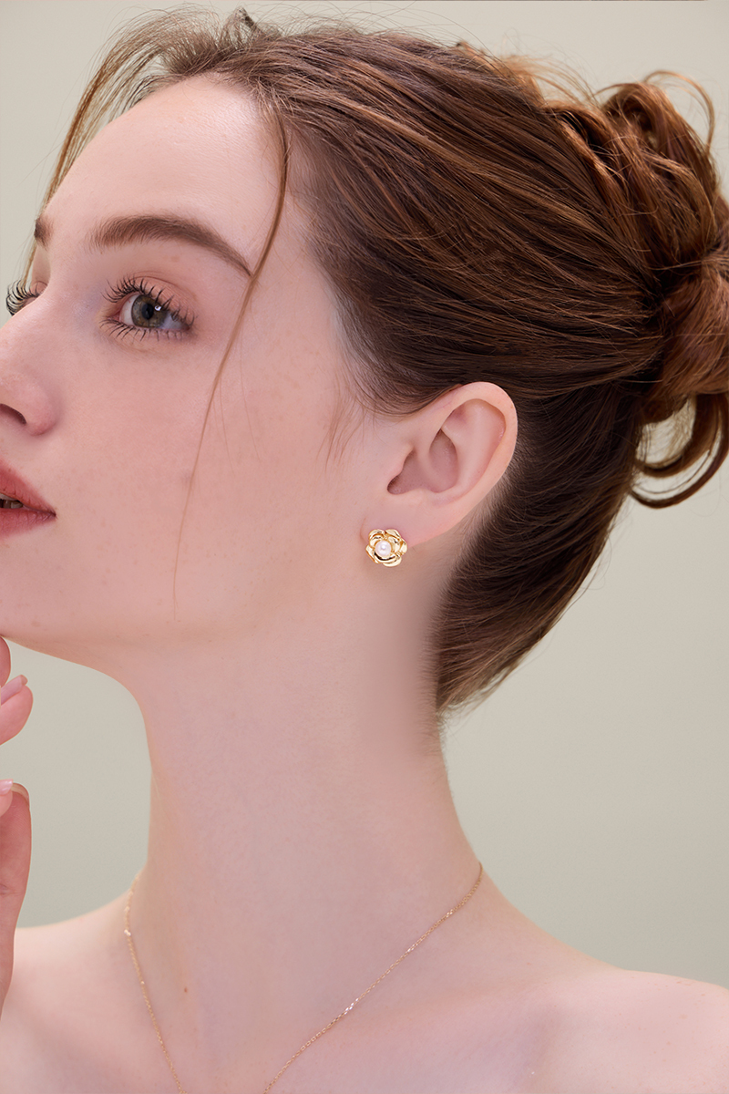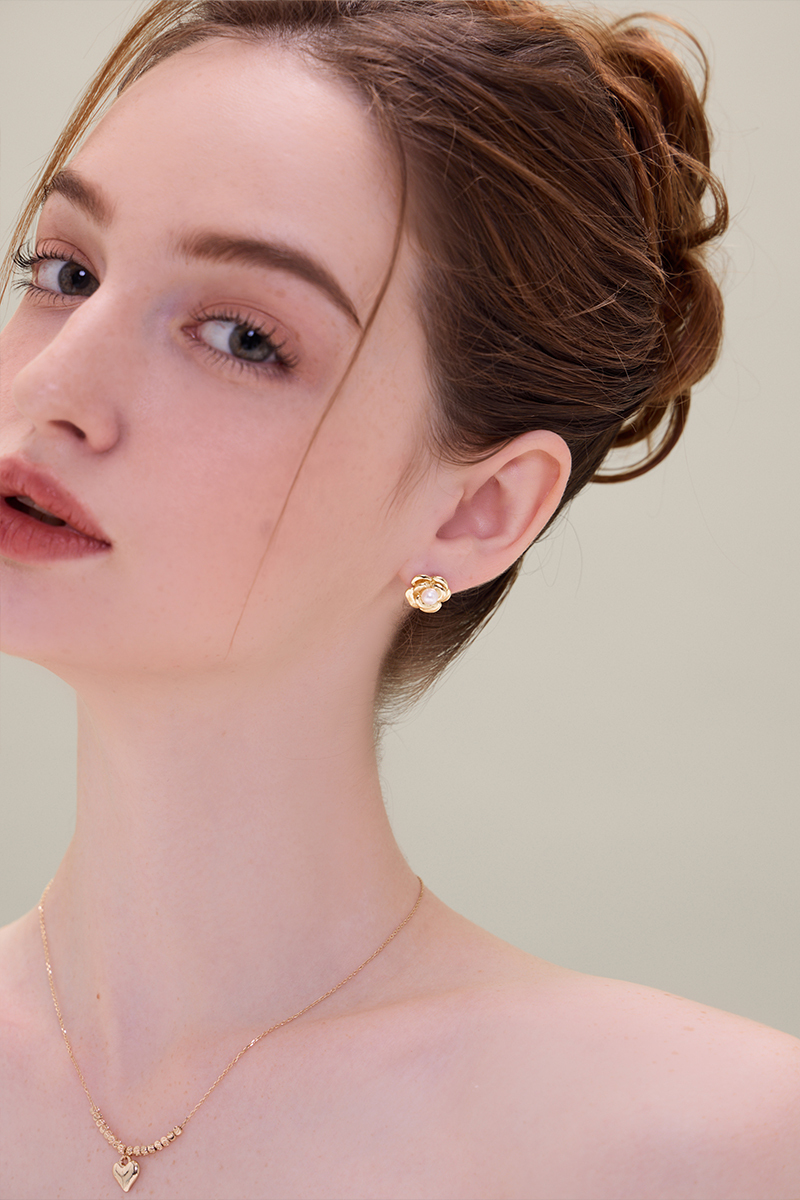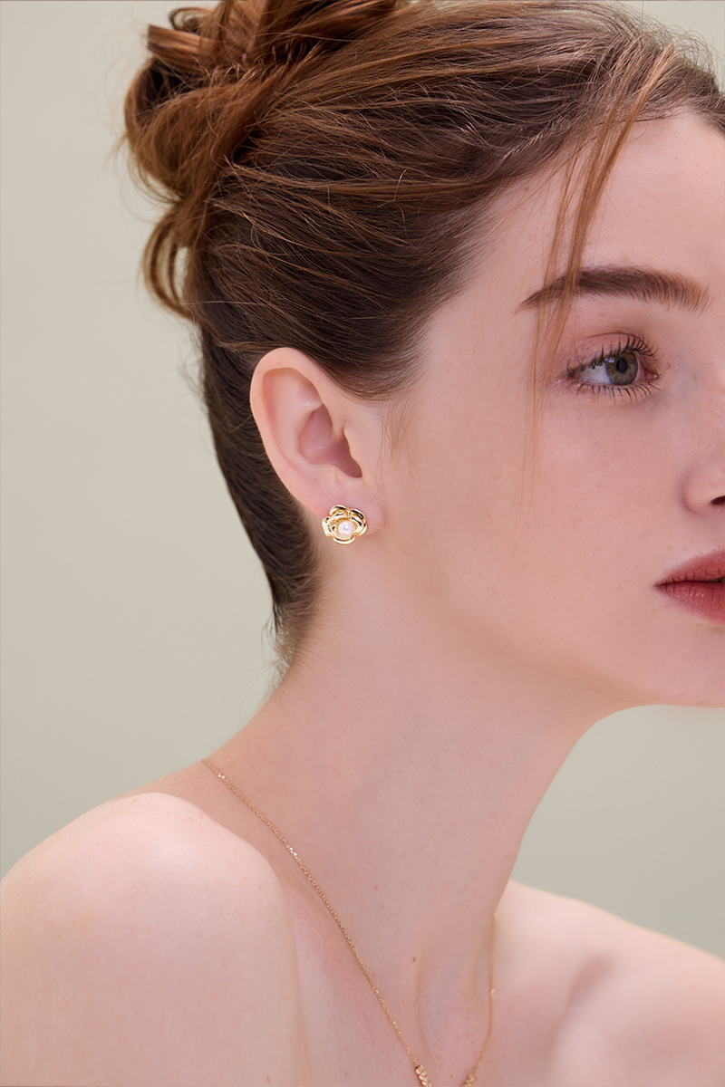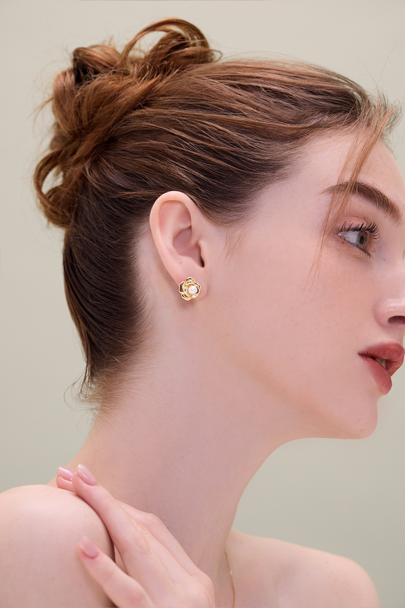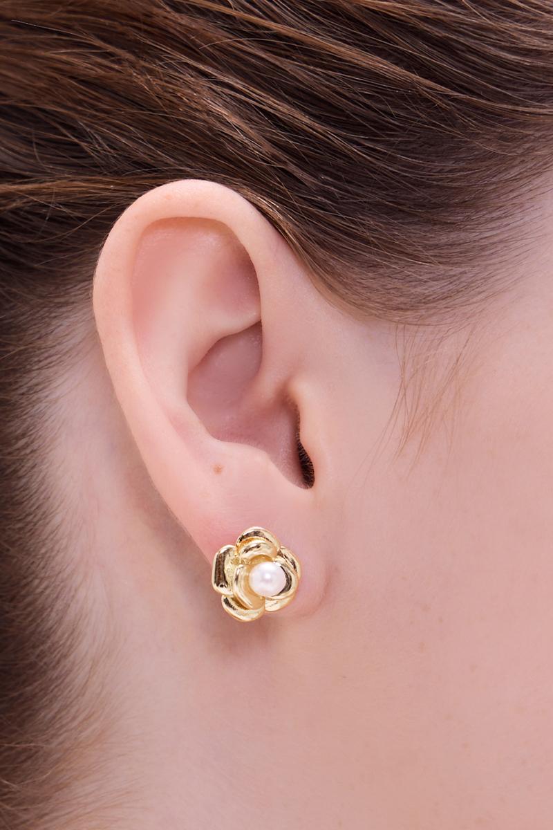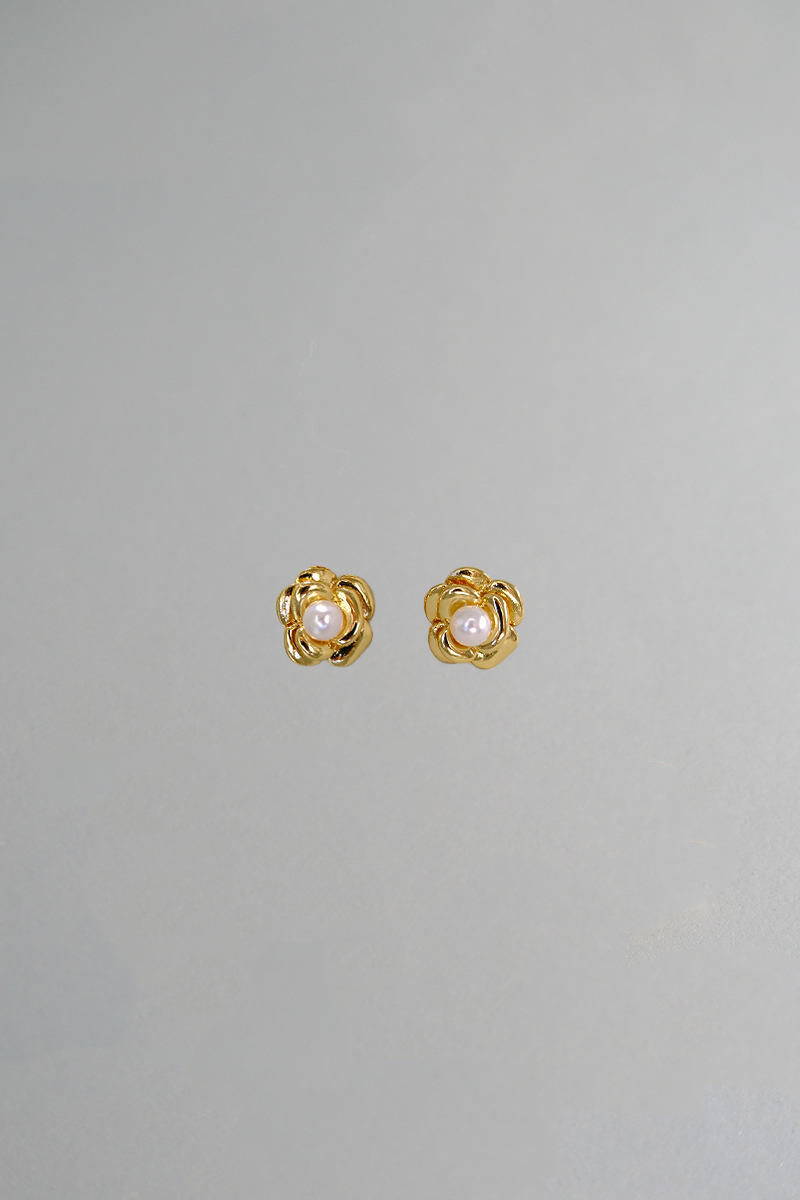 法式優雅金屬珍珠花朵。銀針耳環(金)