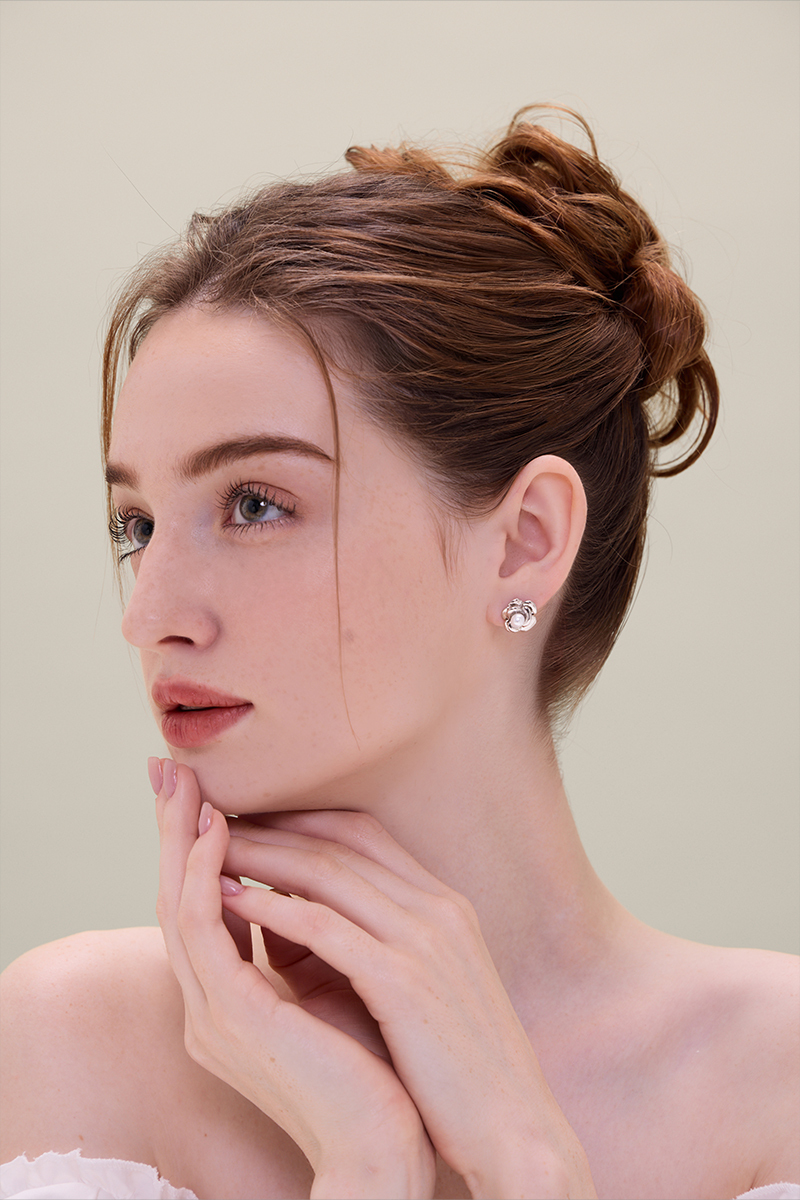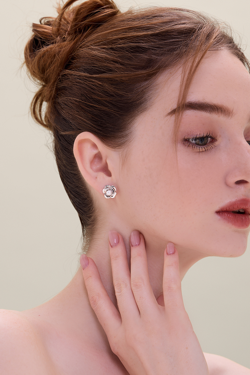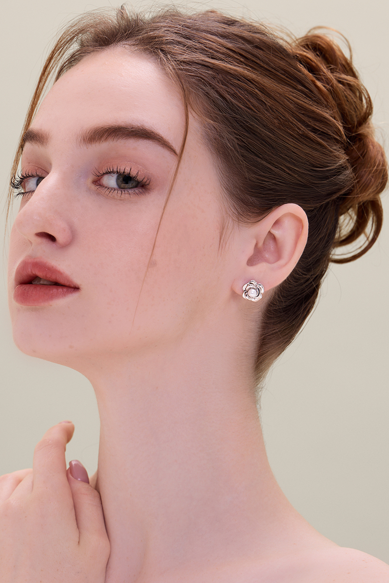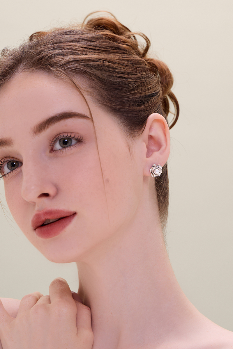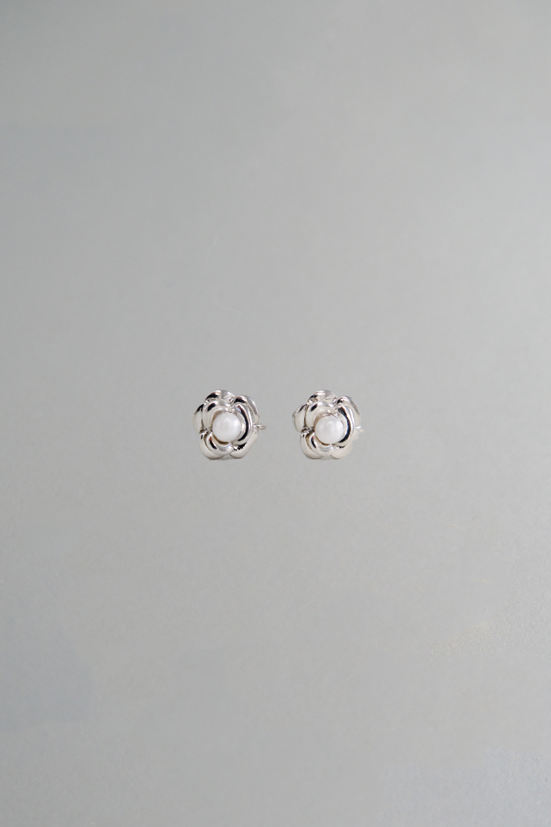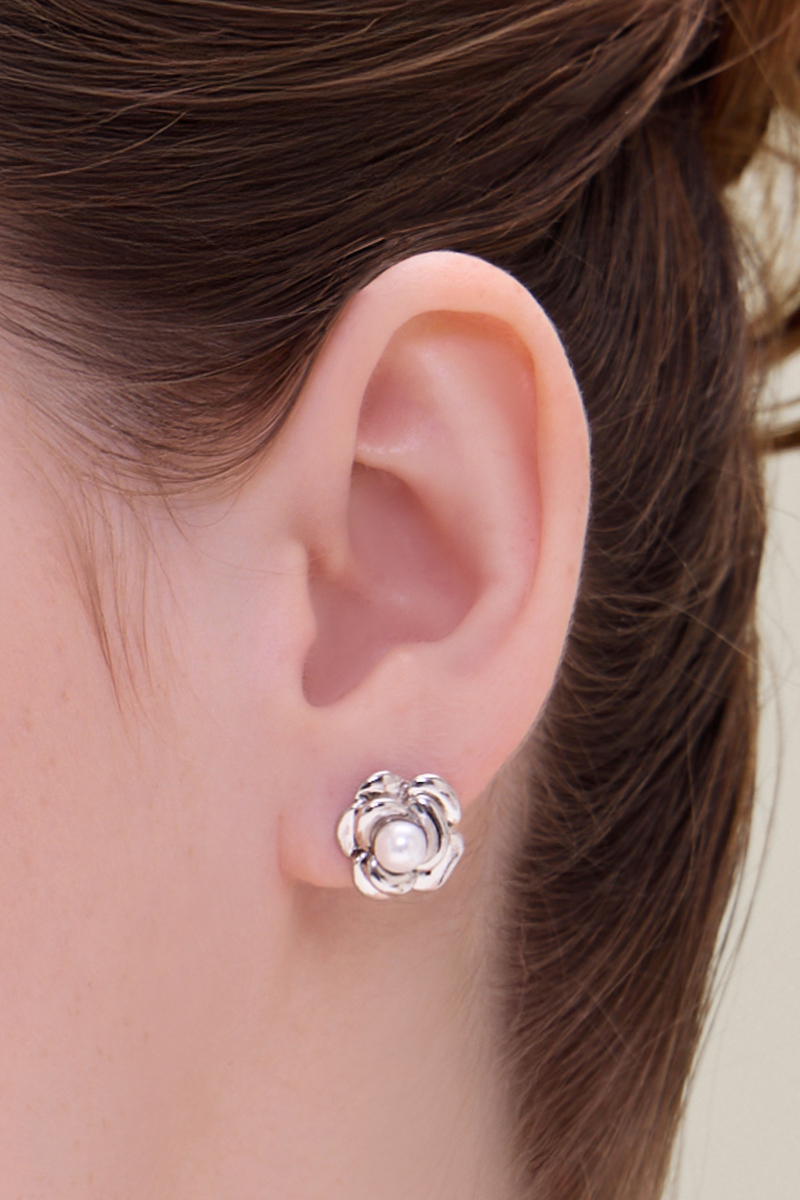 法式優雅金屬珍珠花朵。銀針耳環(銀)