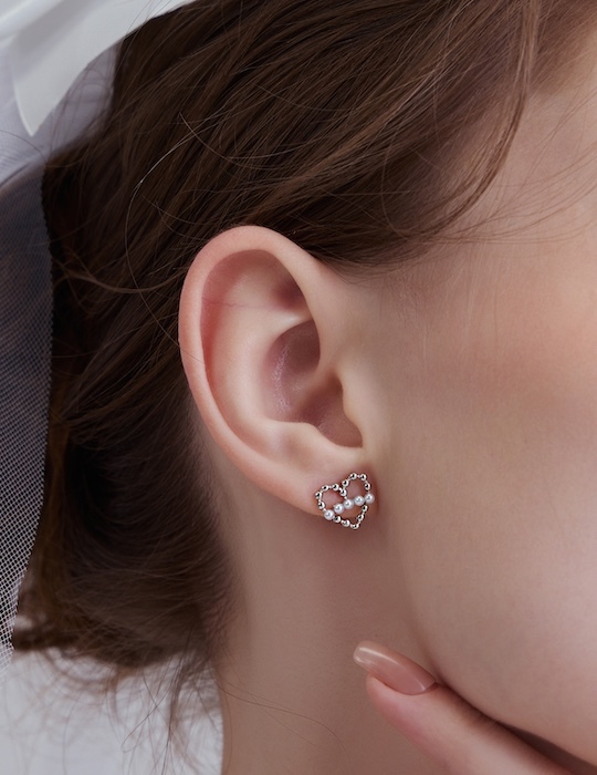 浪漫金屬愛心排珍珠。針式耳環(銀)