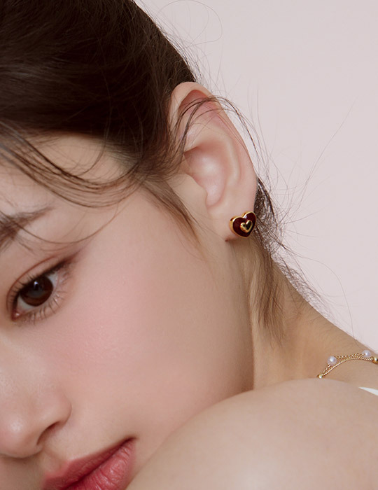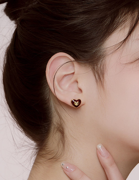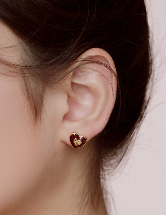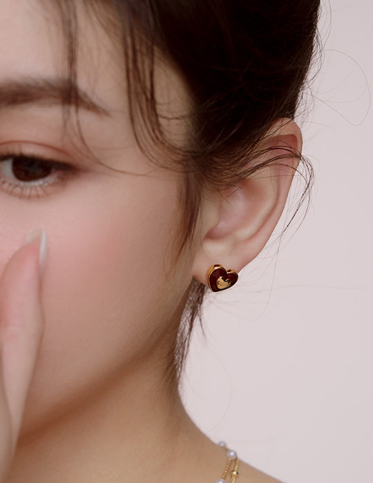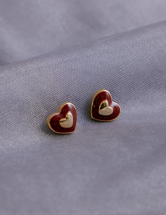 浪漫雙層愛心滴釉。夾式耳環(酒红)