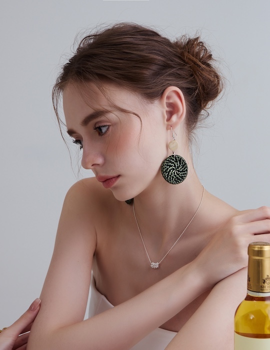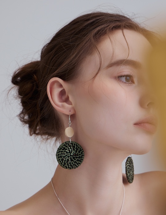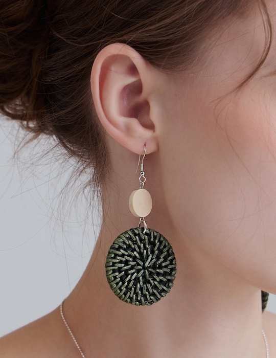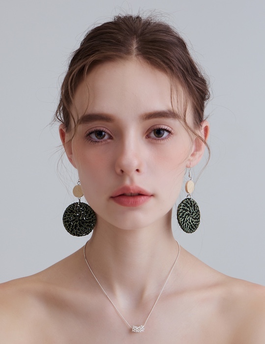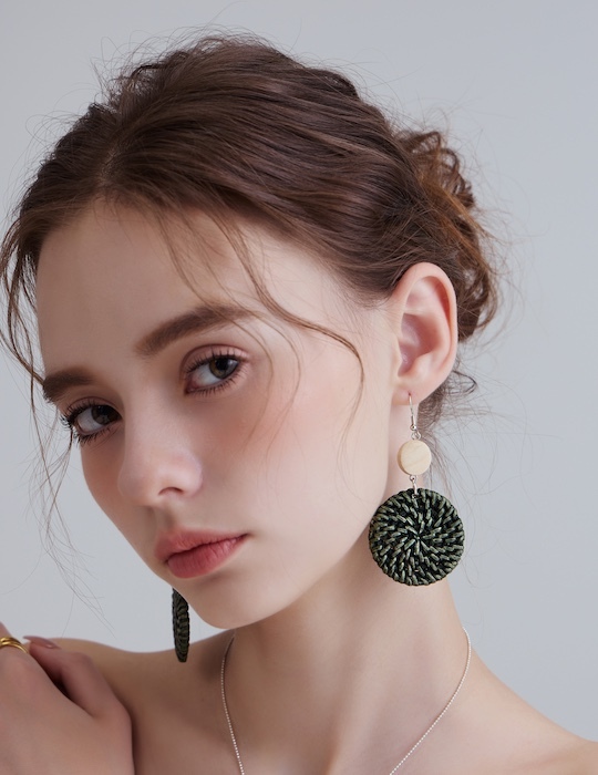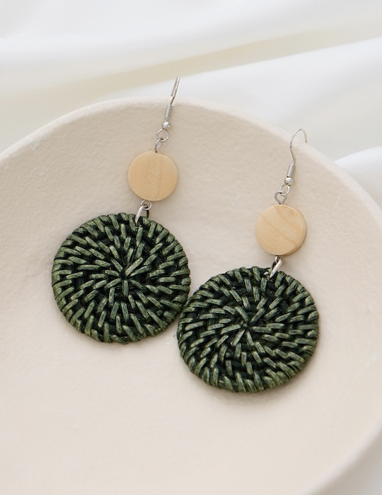 渡假雙圓草編。銀針耳環