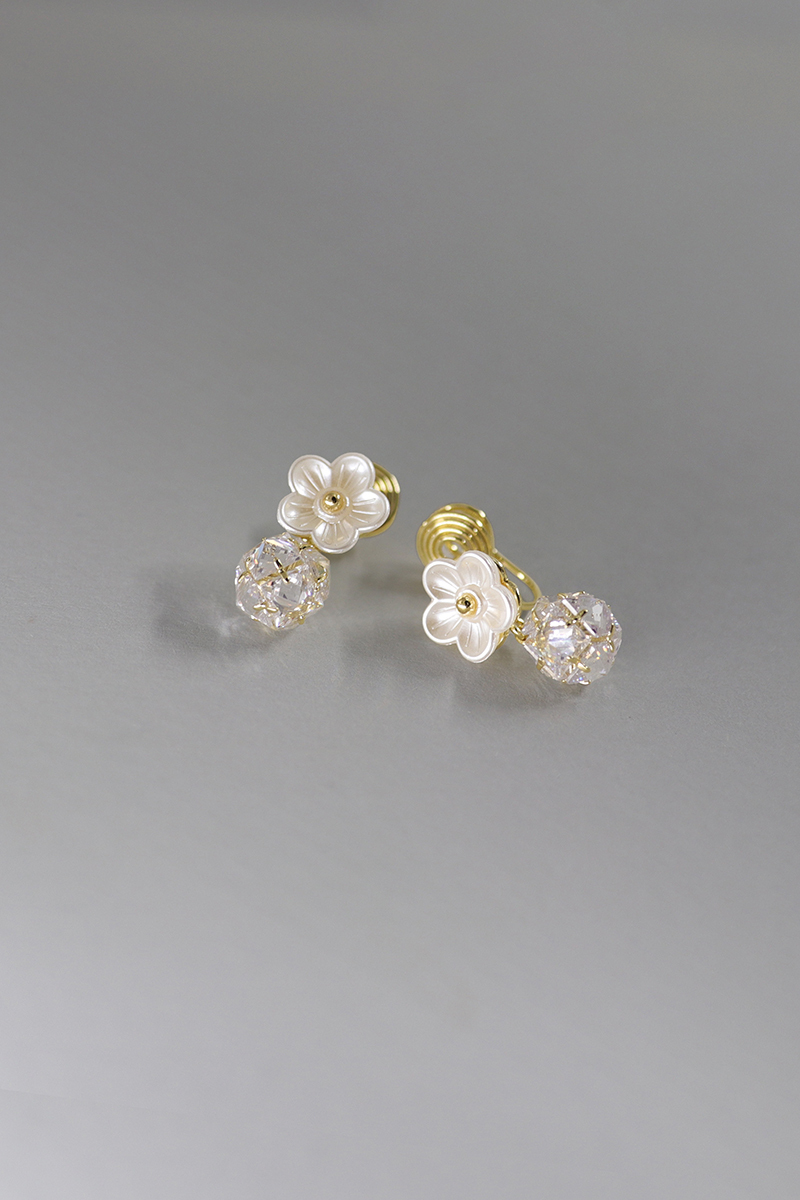 甜美貝殼花朵垂墜鋯石。夾式耳環