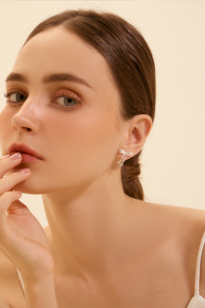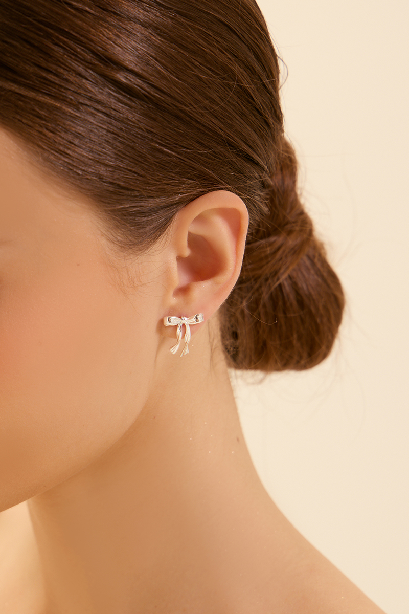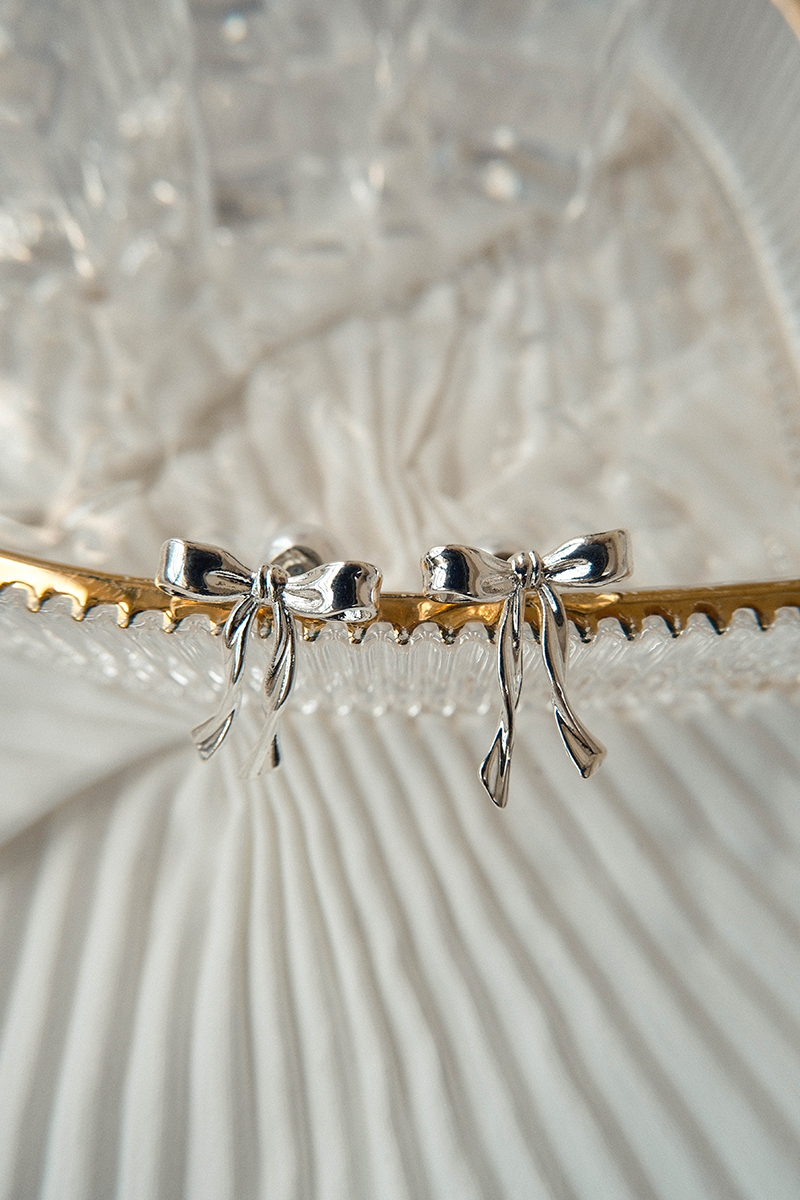 商品名稱:絲帶珍珠蝴蝶結。銀針耳環