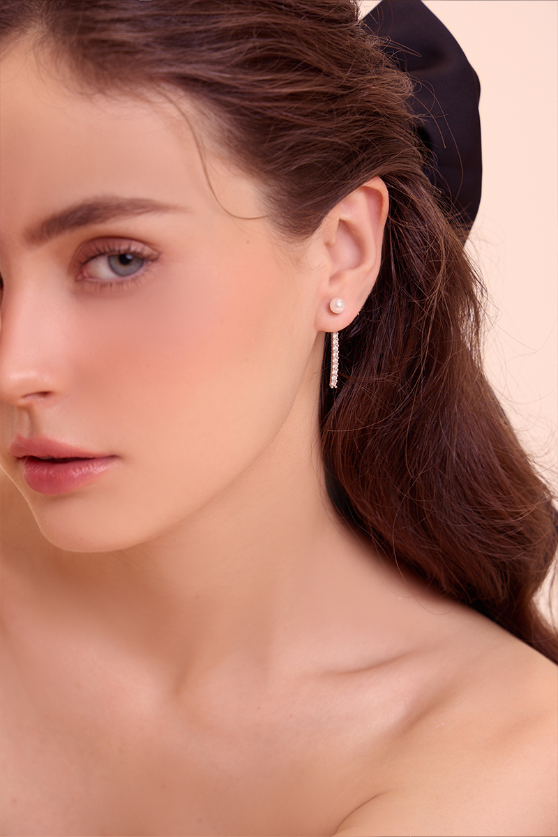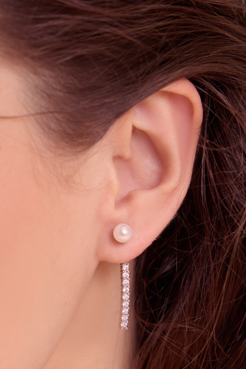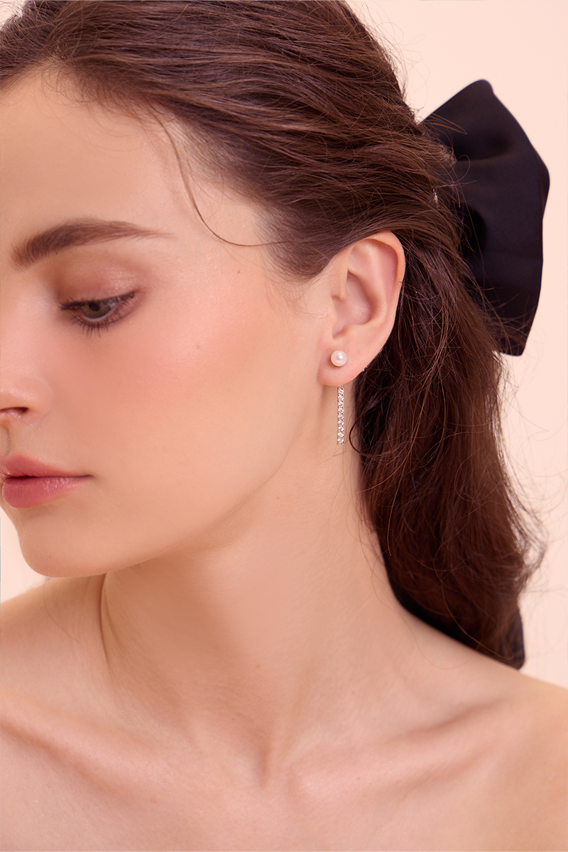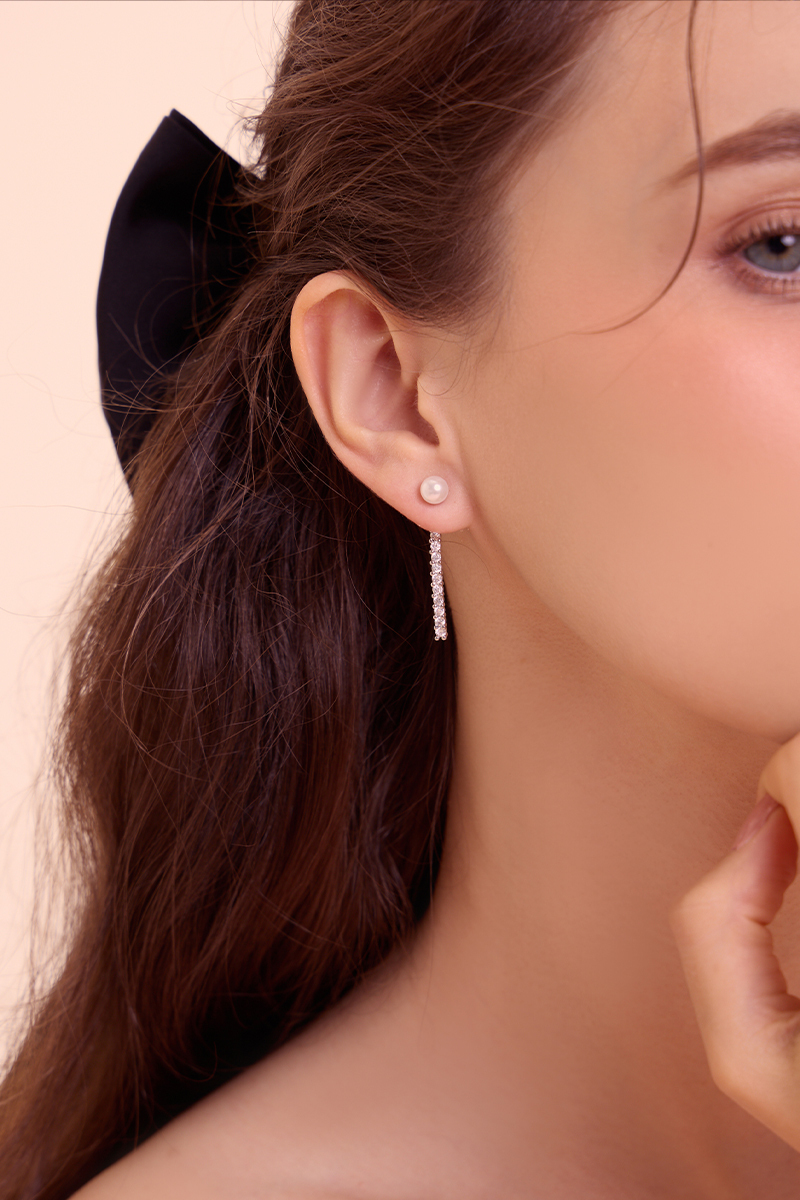 線形垂墜珍珠鋯石。針式耳環(銀)