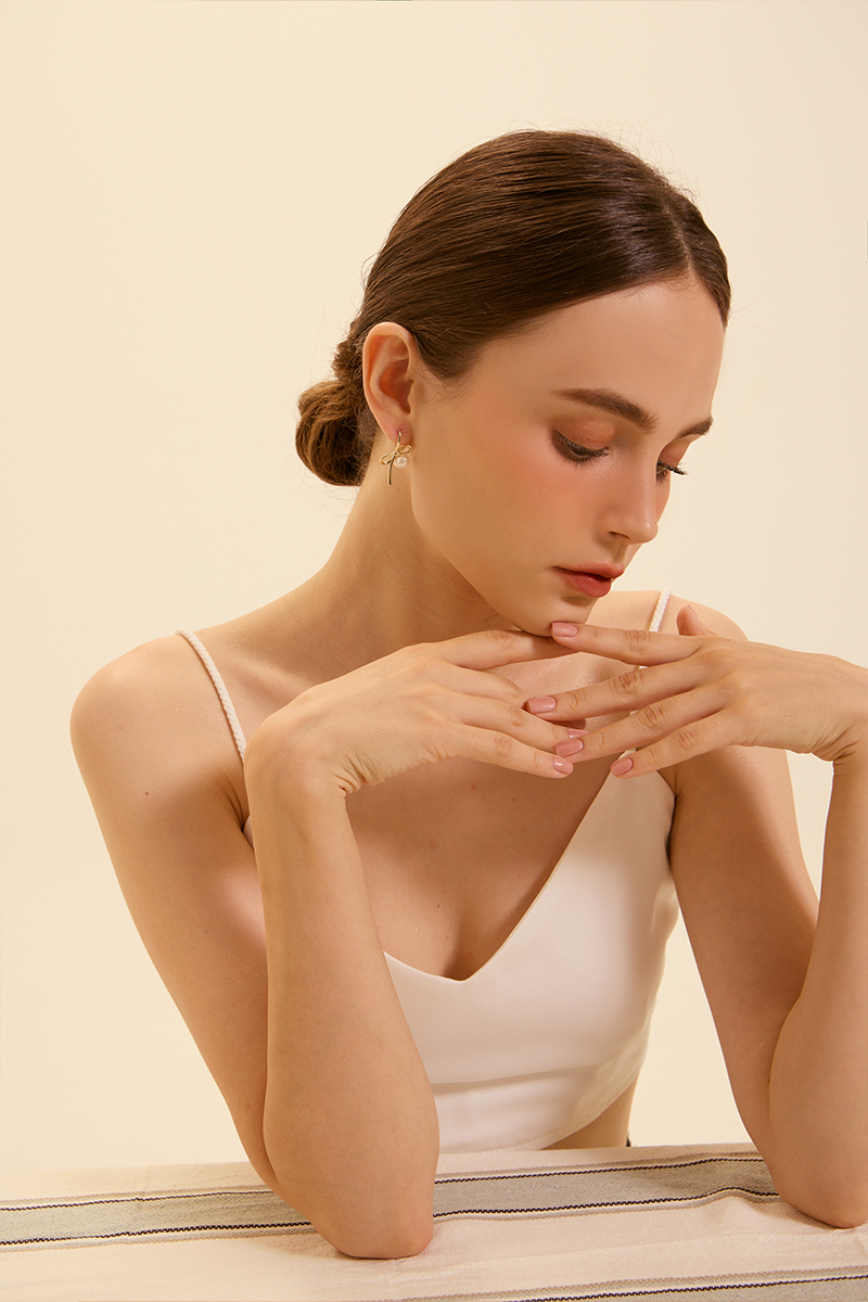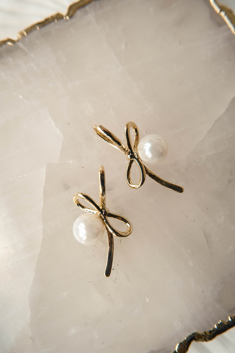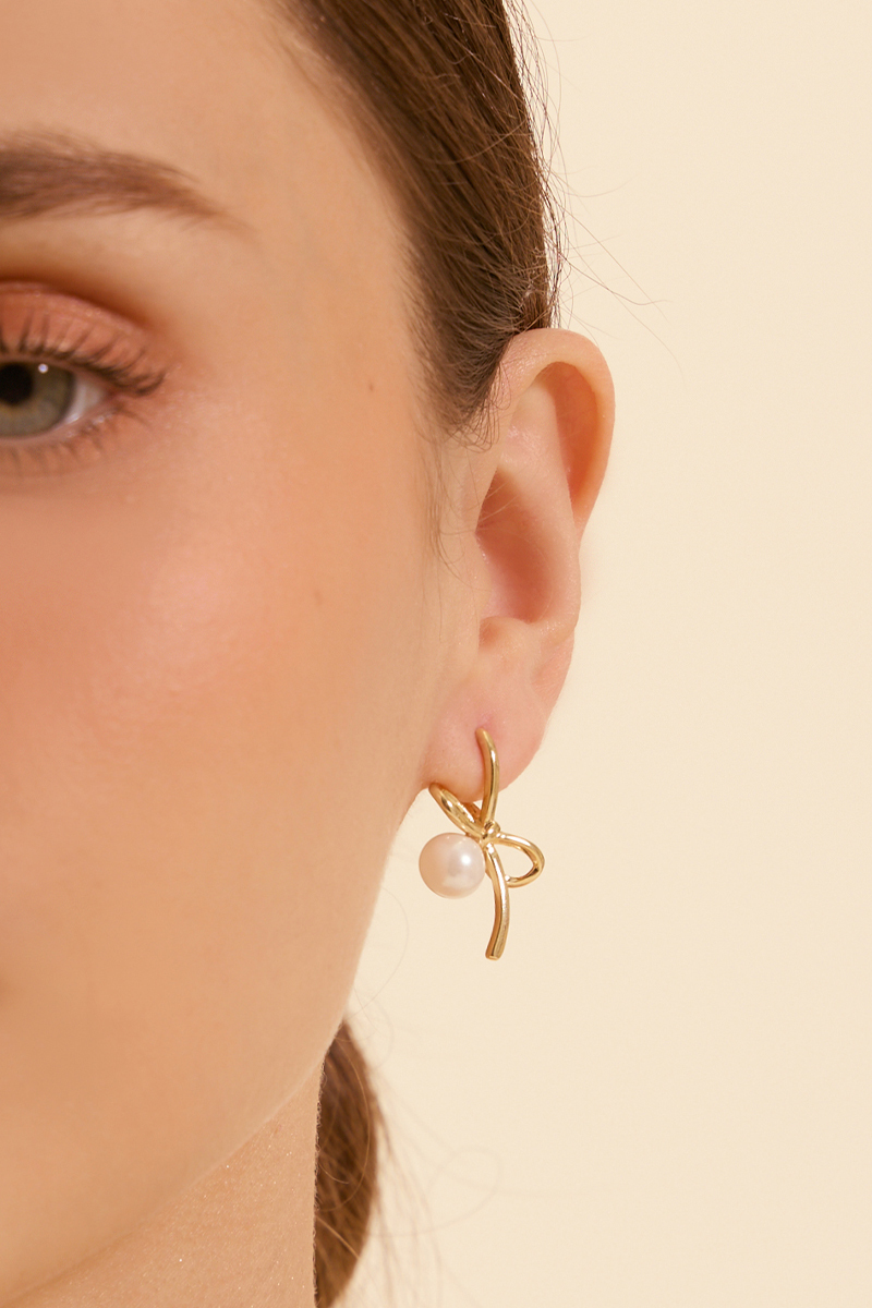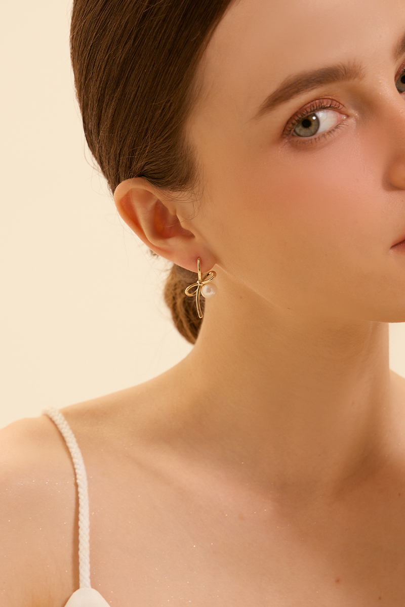 芭蕾蝴蝶結珍珠。針式耳環(金)