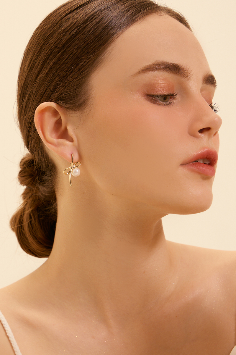商品名稱:芭蕾蝴蝶結珍珠 。針式耳環(金)