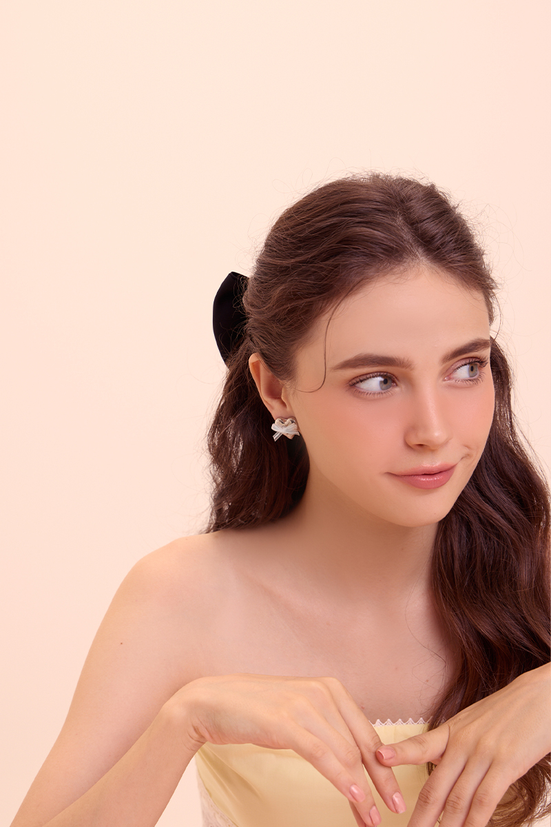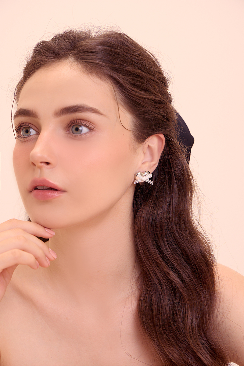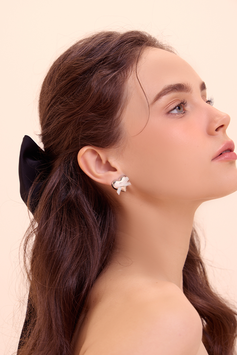 商品名稱: 蕾絲絲帶蝴蝶結愛心。針式耳環(白)