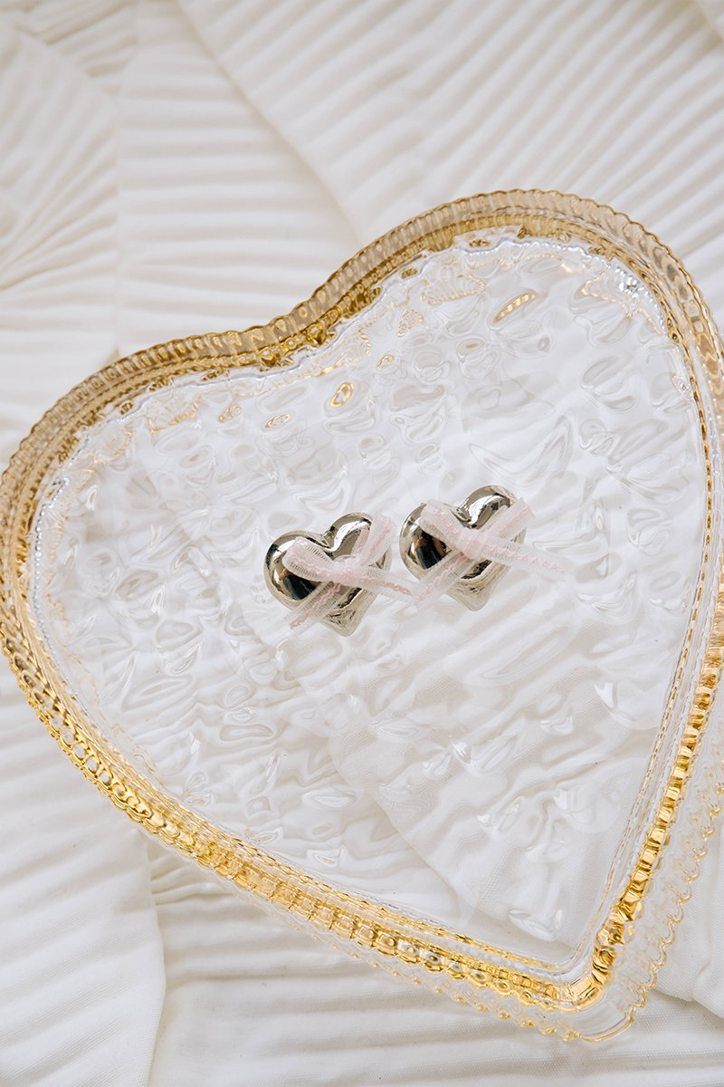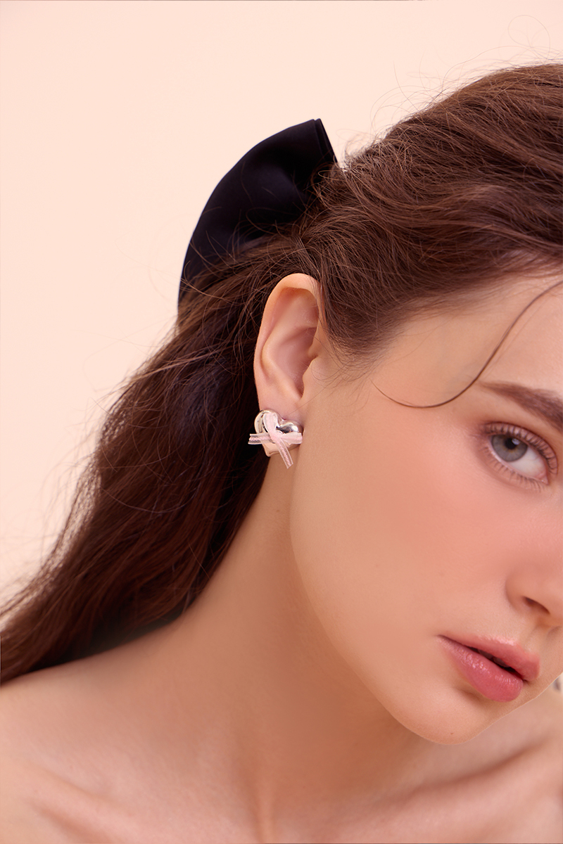 蕾絲絲帶蝴蝶結愛心。針式耳環(粉)