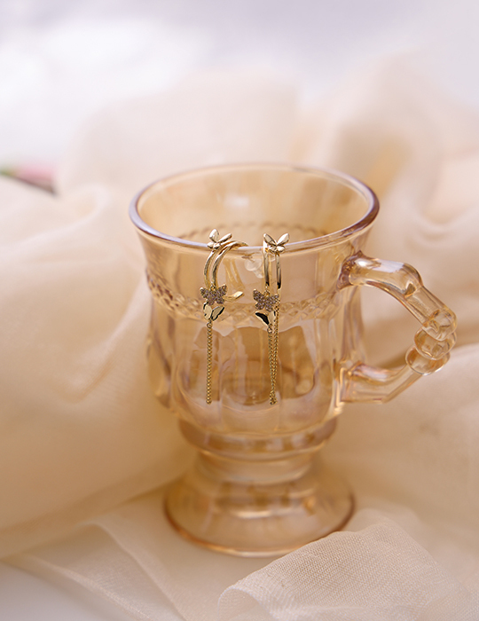 蝴蝶鋯石垂墜流蘇。銀針耳環
