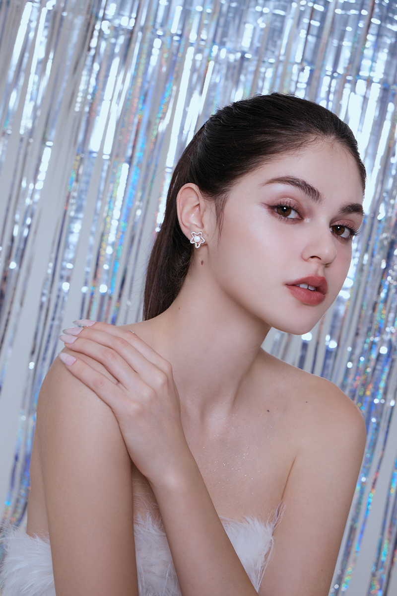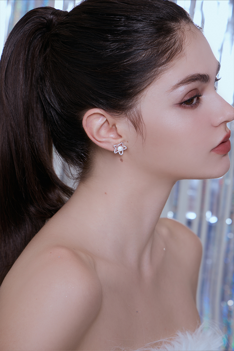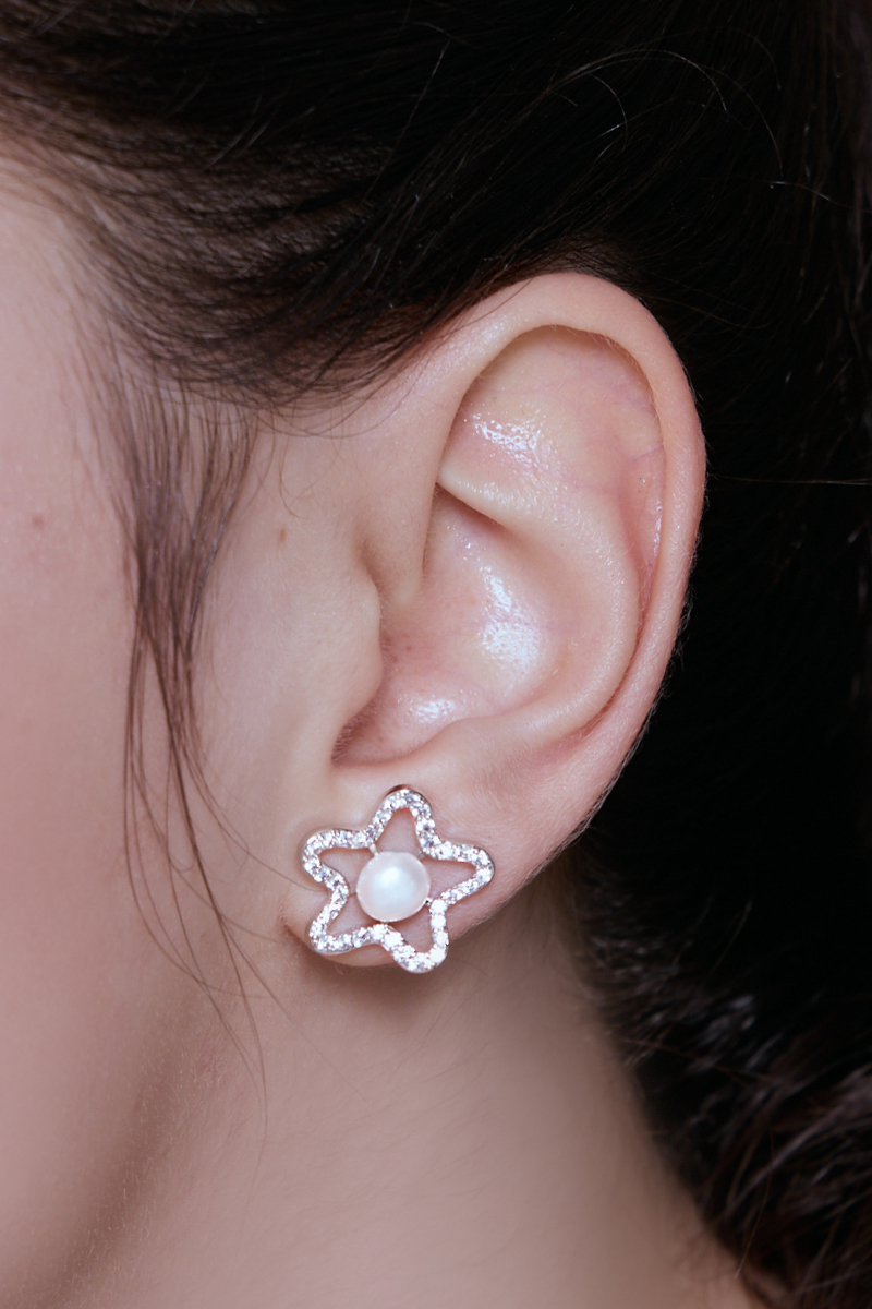 商品名稱: 鑲鑽花朵淡水珍珠。銀針耳環